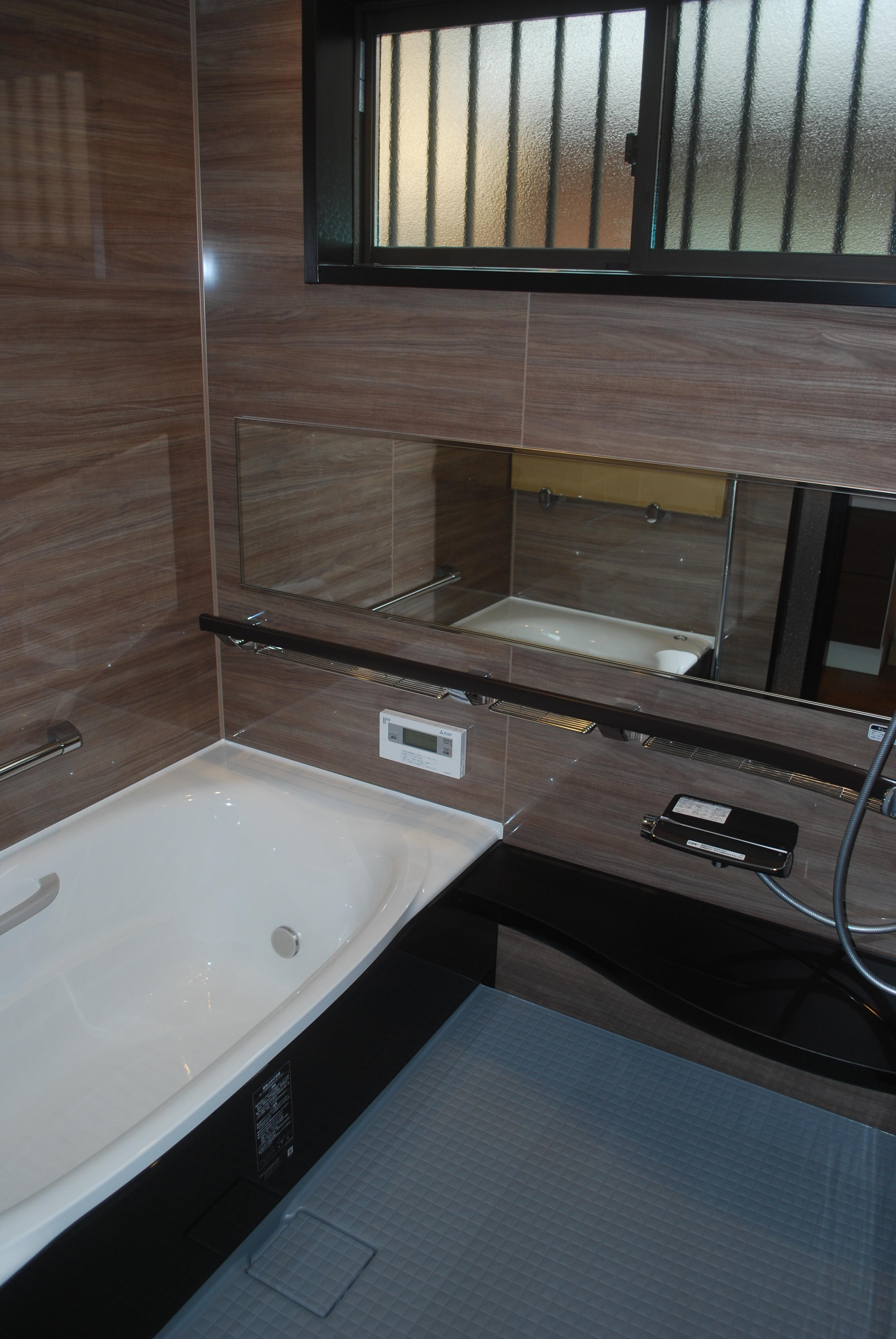 壁は4面とも鏡面仕様とし、大型のミラーを採用。高級感溢れる浴室になりました。