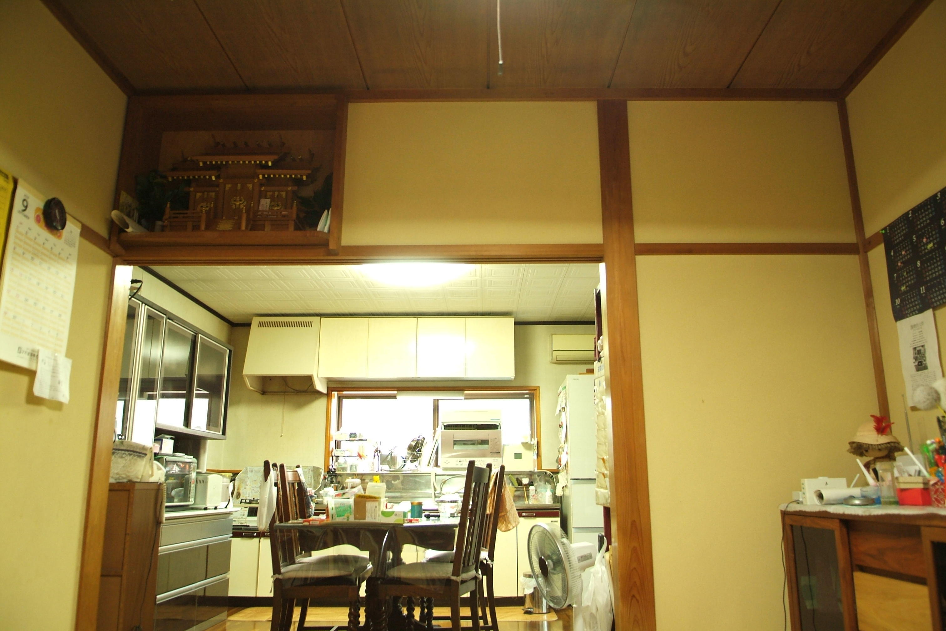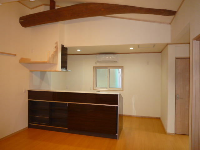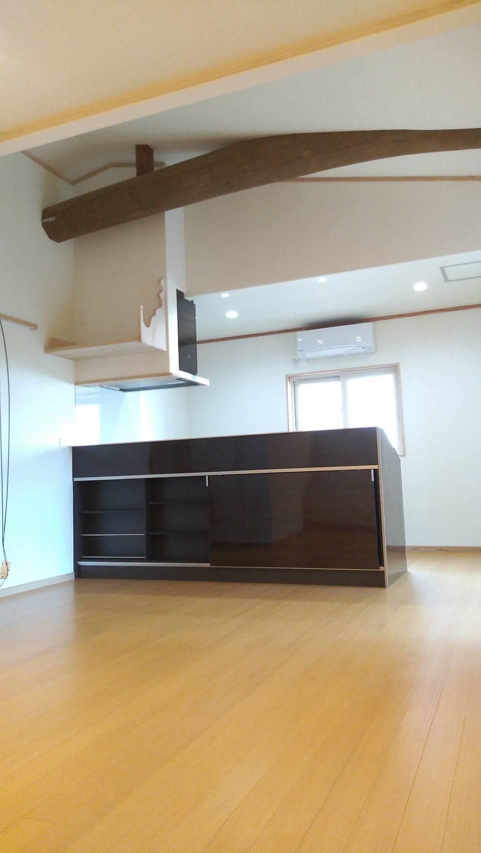 キッチン上部は天井を撤去。丸太梁を化粧で魅せて味わいある空間に変身しました。