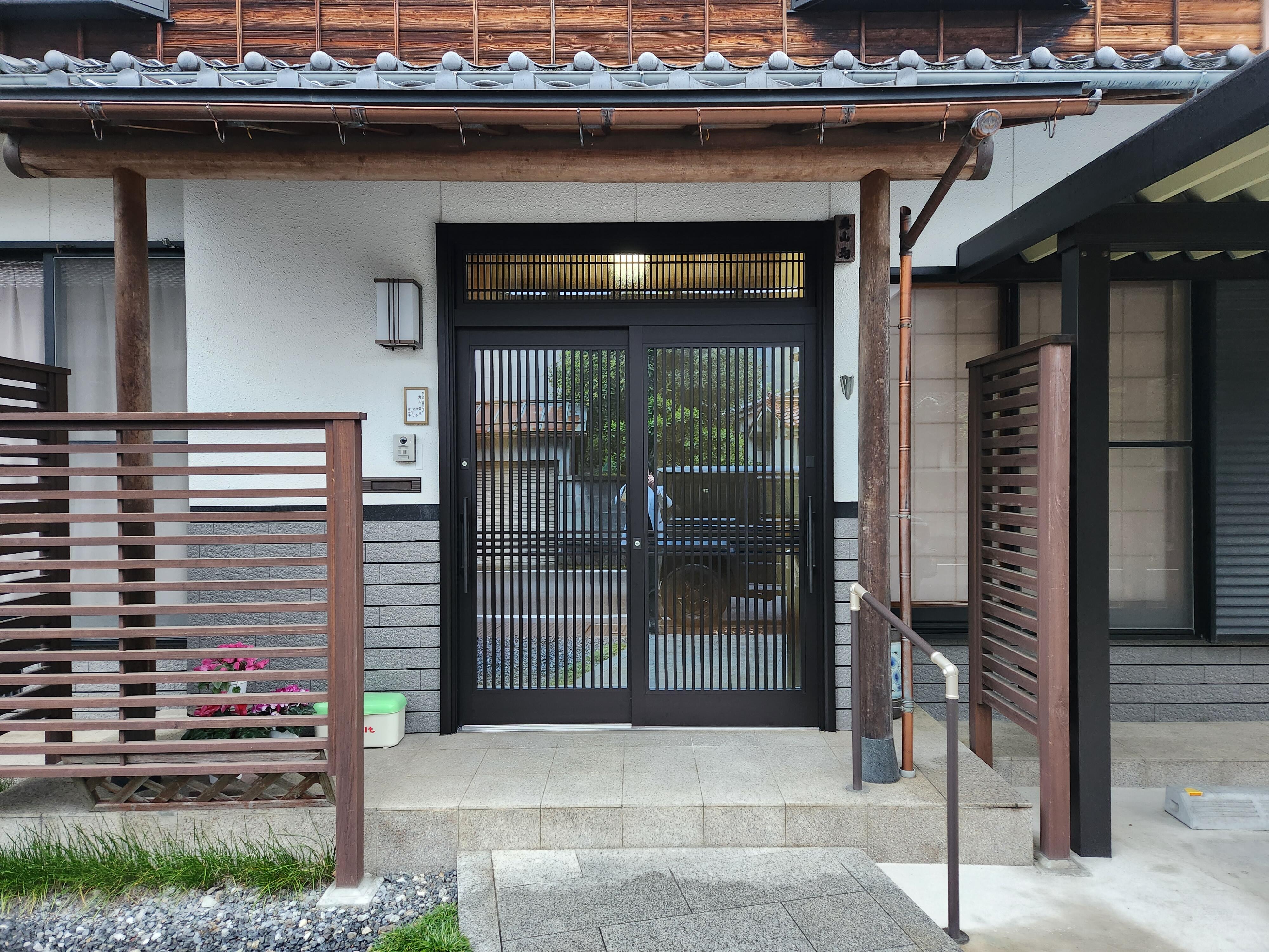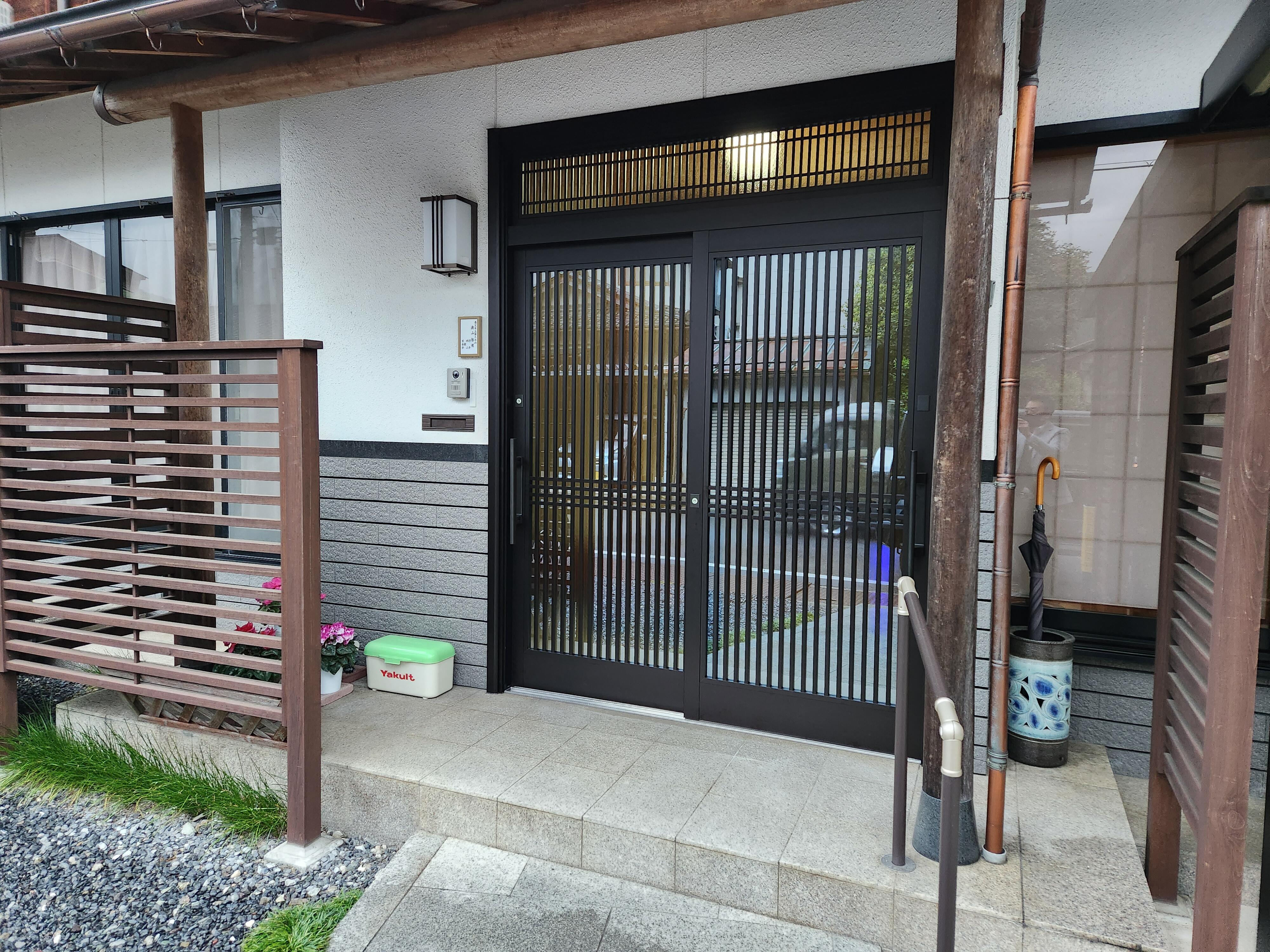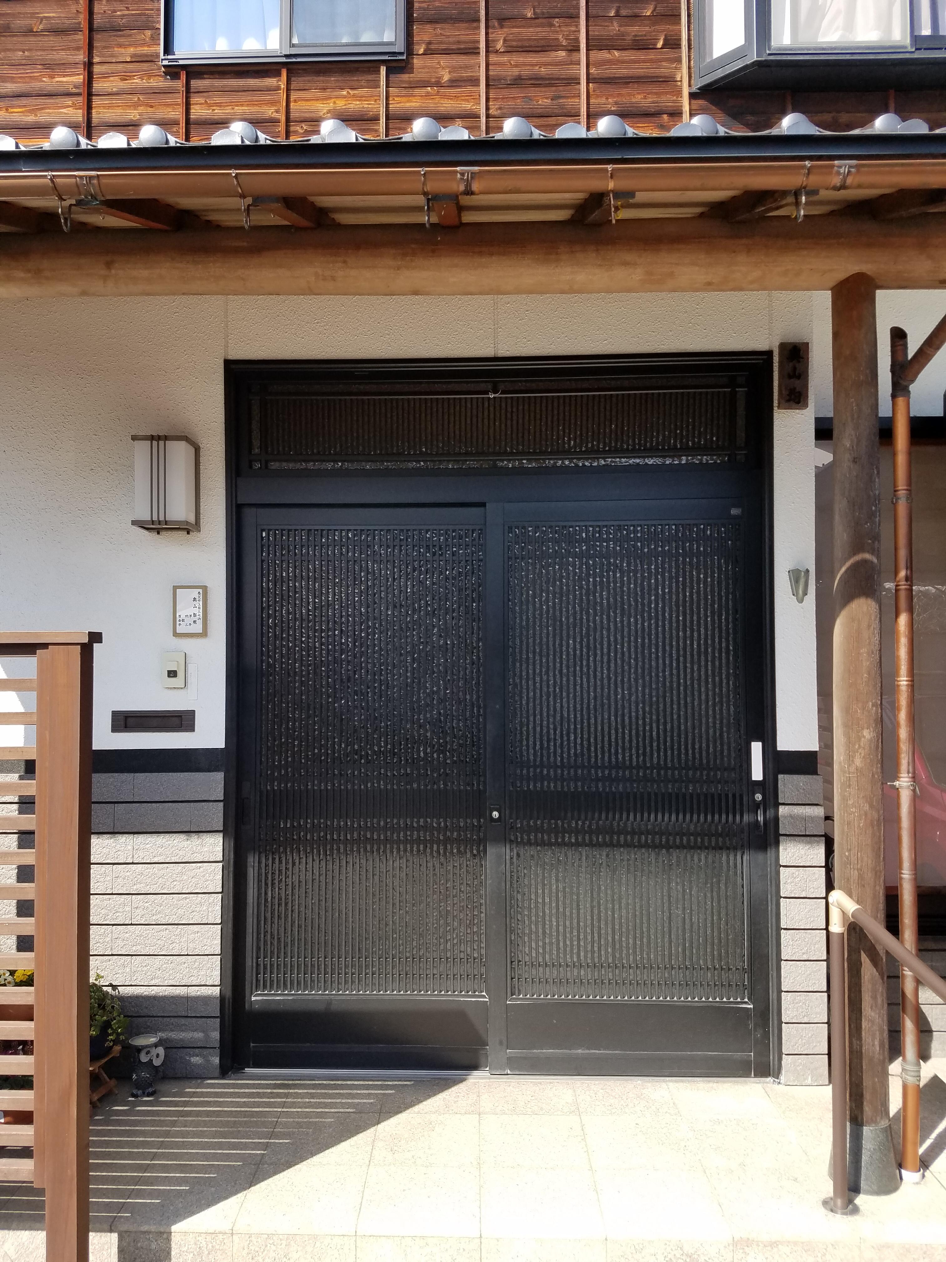 今までの和風玄関引き戸はアルミの単板ガラスで寒かったため、断熱化を計画、外観に見合う様ように和風の引違い戸のまま断熱化を計りました。