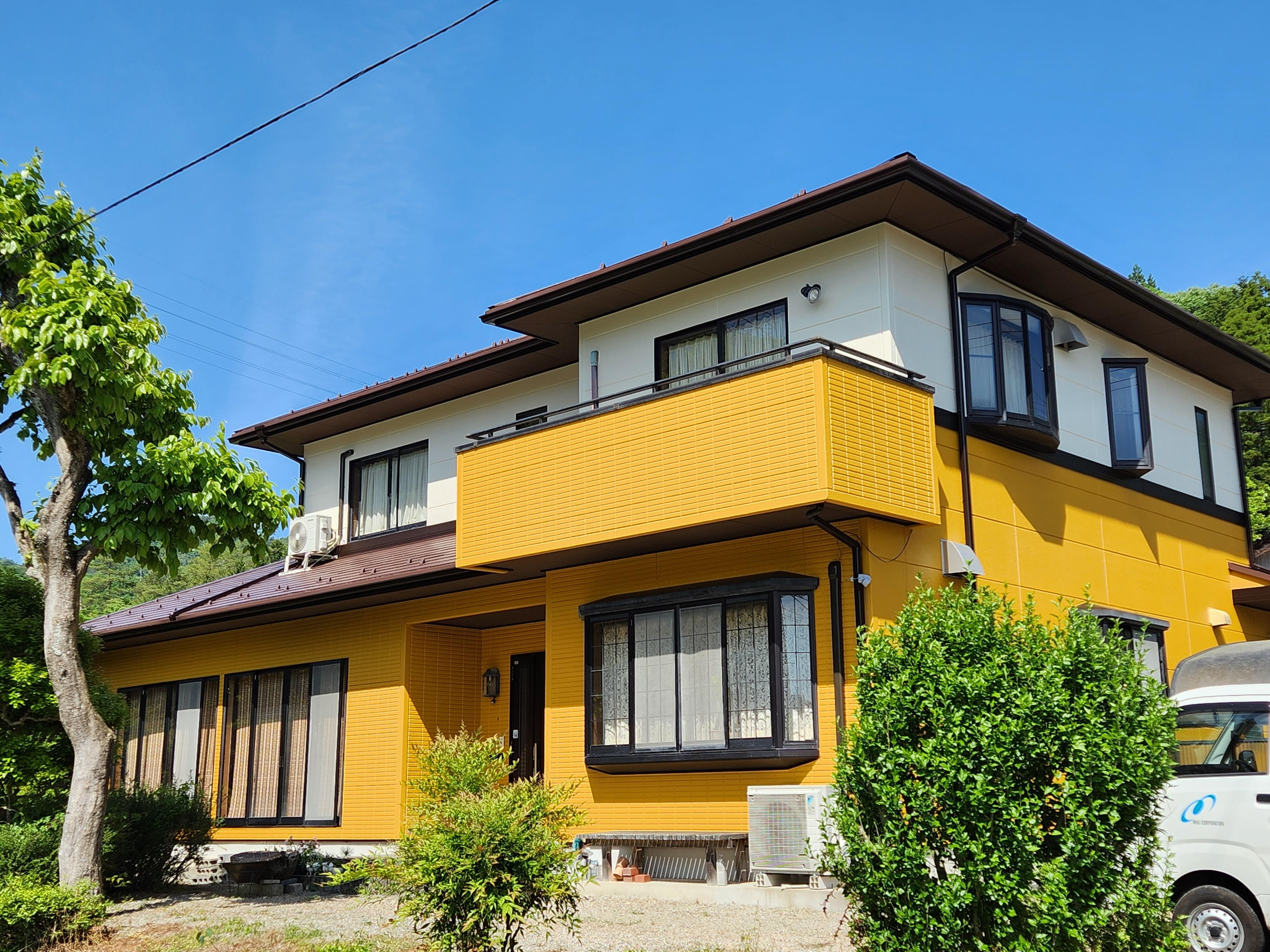築25年超のお宅の外装をリニューアルしました。外壁はもちろん屋根、帯、軒天、雨樋など見えるところをすべて塗装しました。青空に映え、気分まで明るくなります。