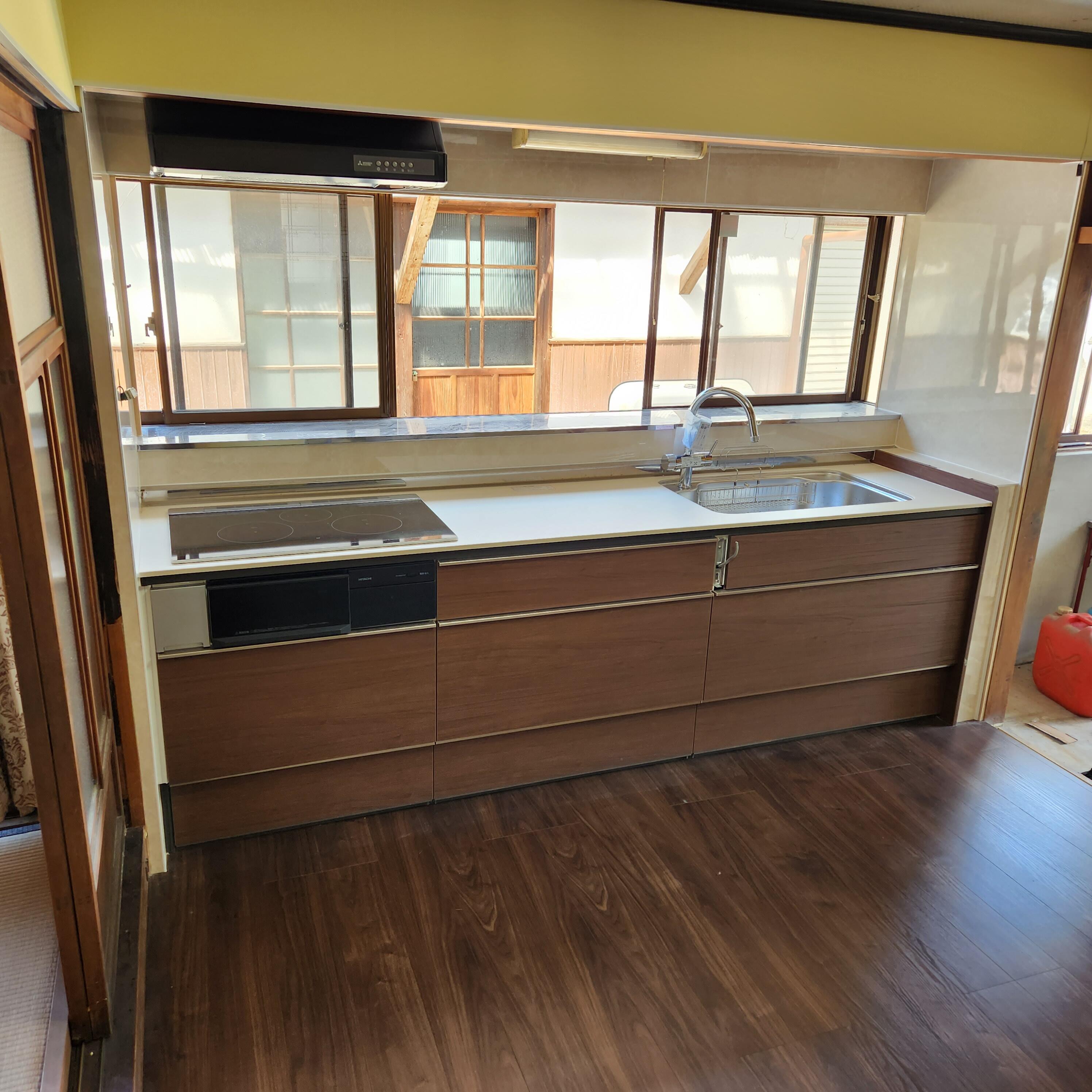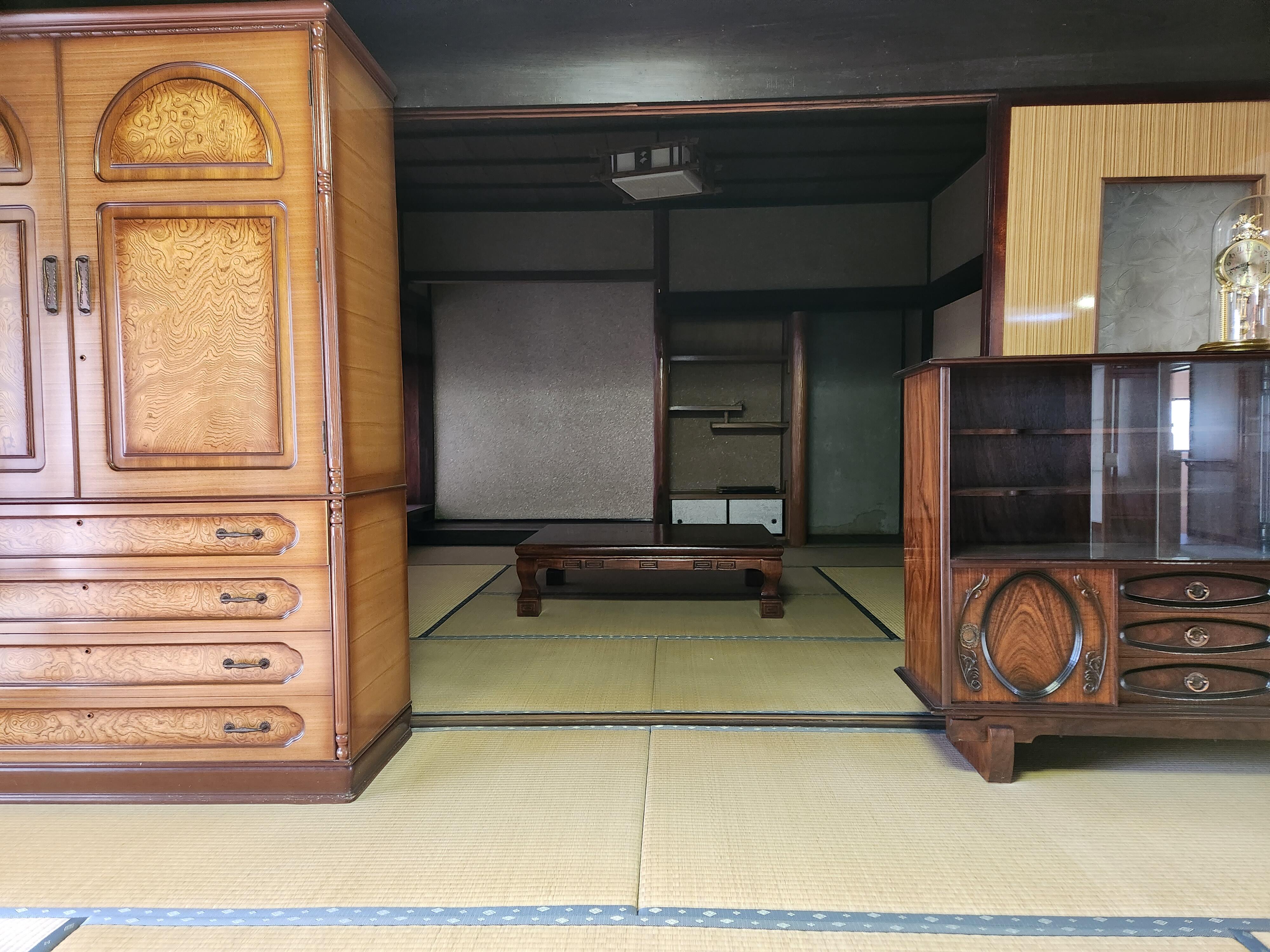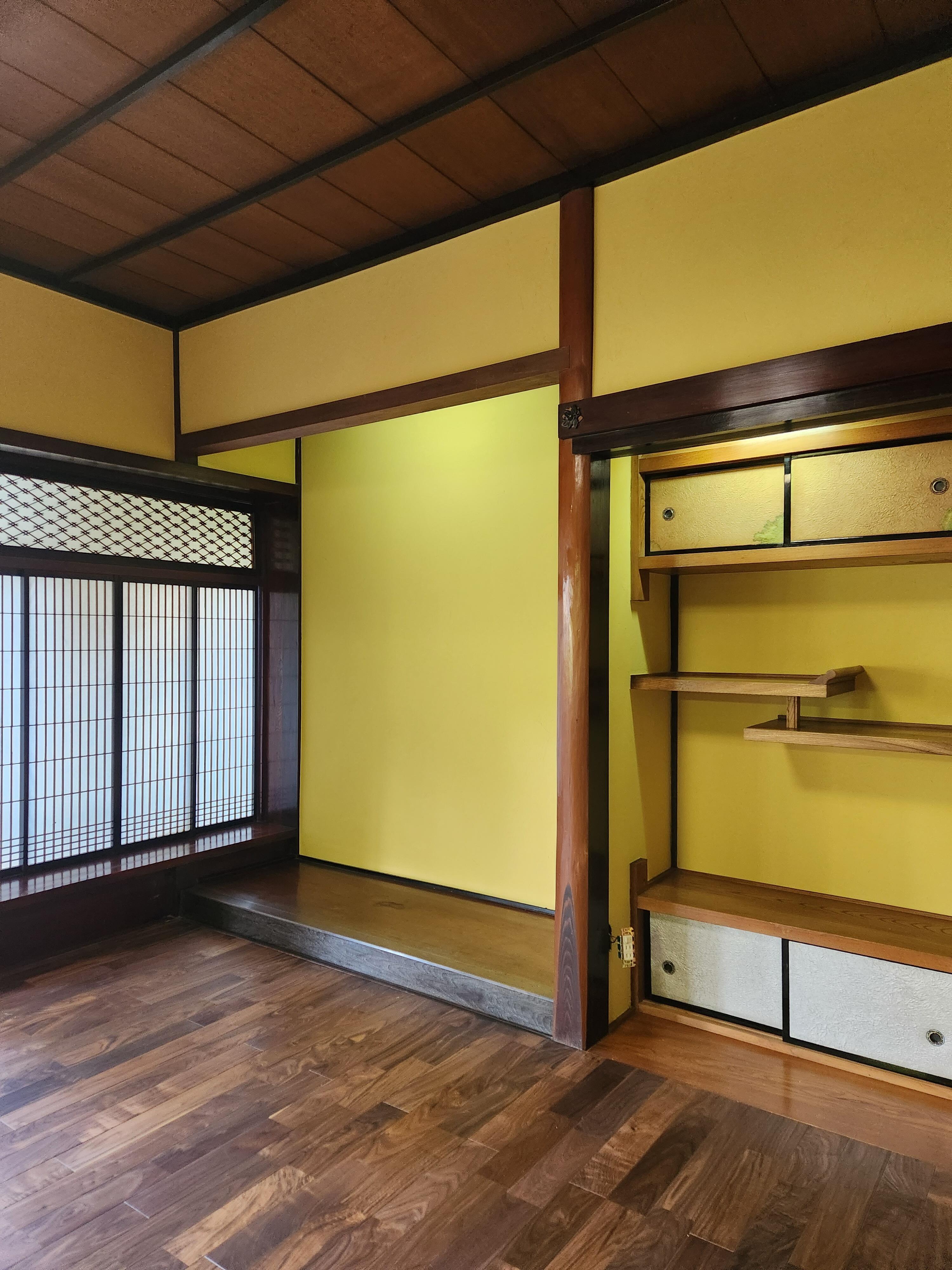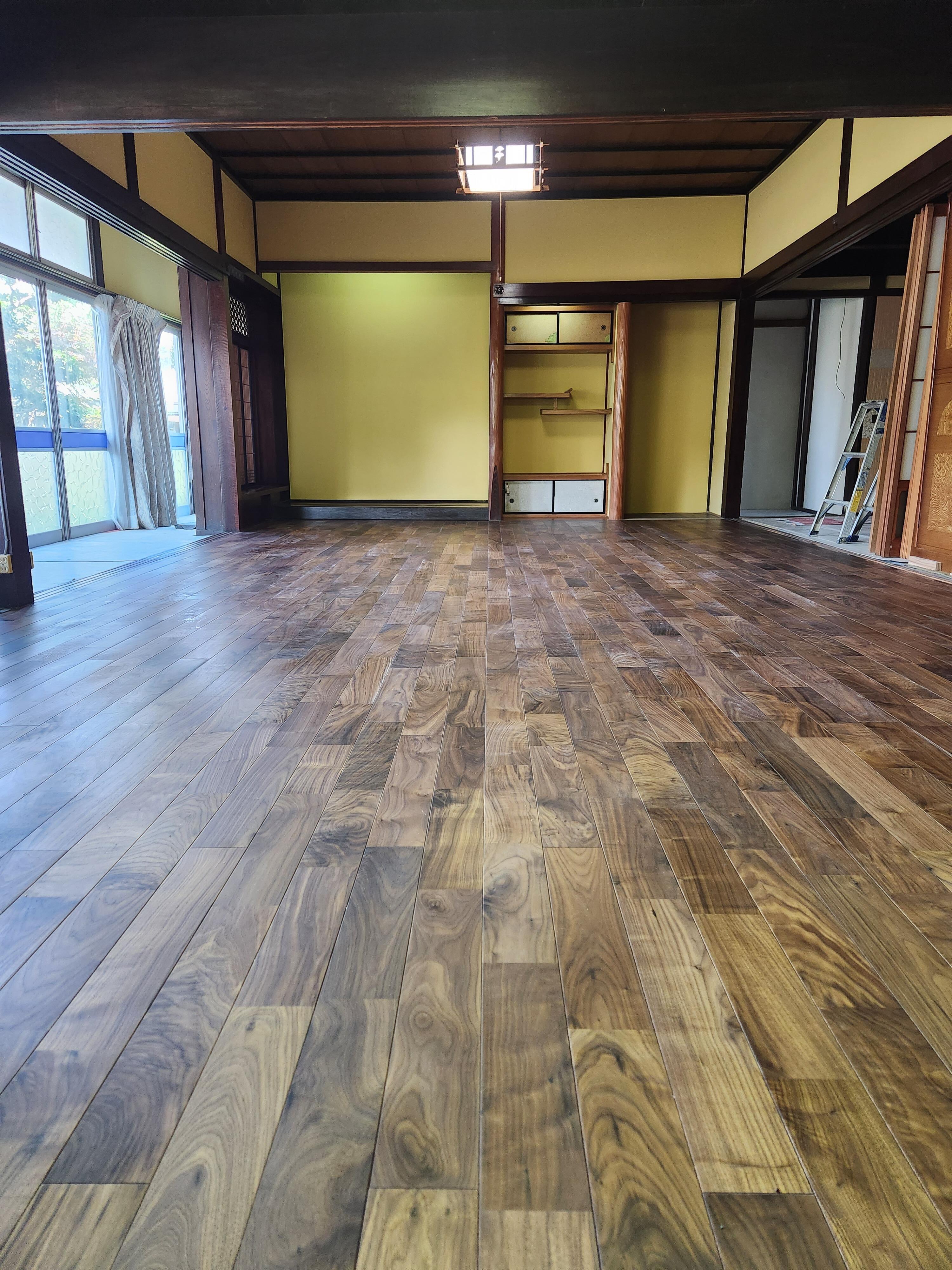 空き家だった古民家を空き家バンクで購入されたお施主様、二間続きの和室を、和室の良いところはそのままにリビングへと変身させました。 綿壁を撤去し、明るい色の左官壁で塗りなおしました。床はアメリカンウォールナットを大胆に使い、広々リビングルームへと生まれ変わりました。