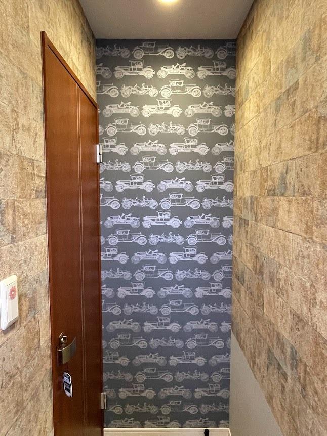 ビンテージ感ある大きめな石目調のクロスにこれまたビンテージ感のある車のアクセントクロス