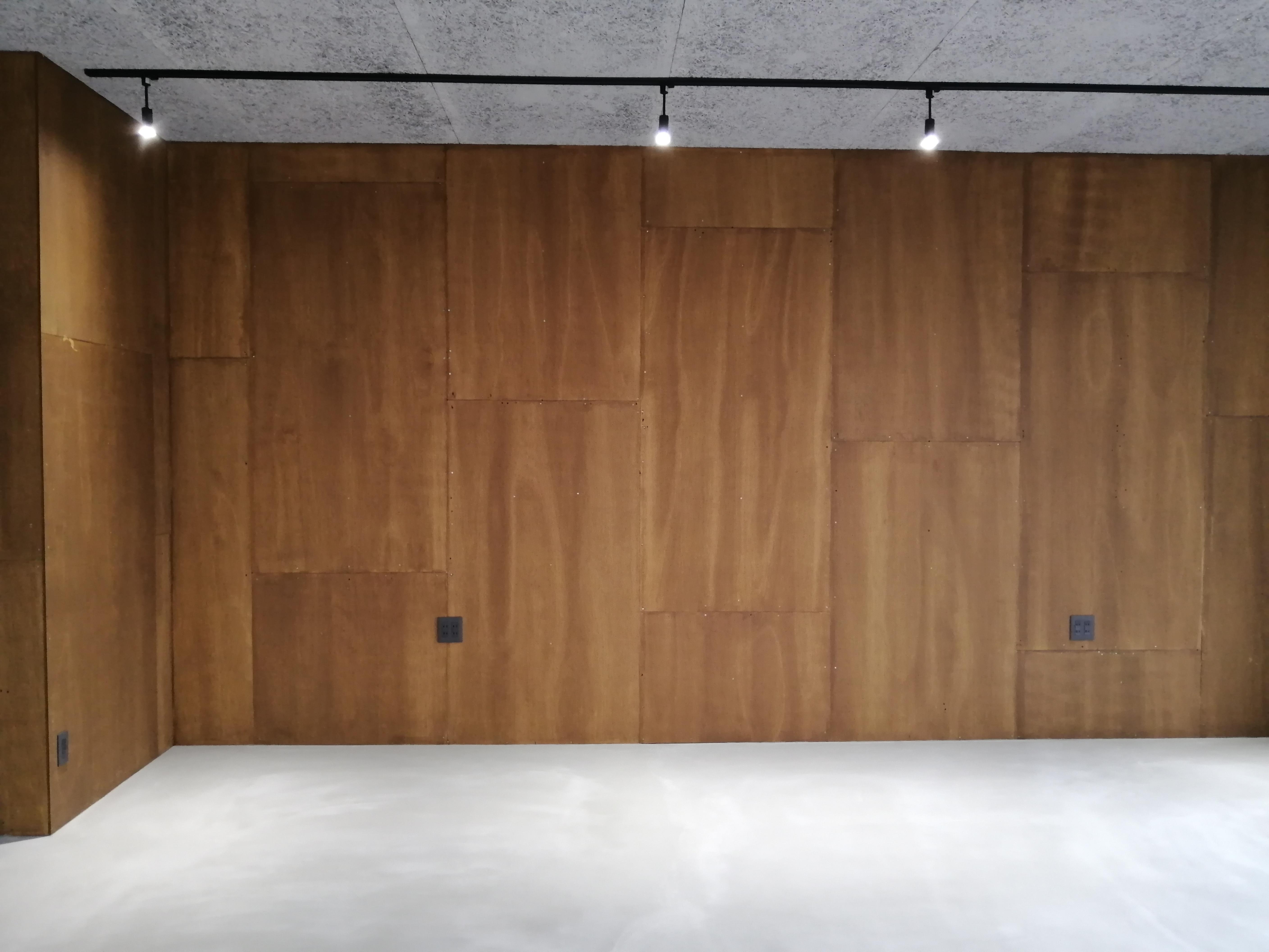 壁には合板を使用。ビスやビス穴をそのまま残す事で「倉庫空間」を創り出す事ができました。