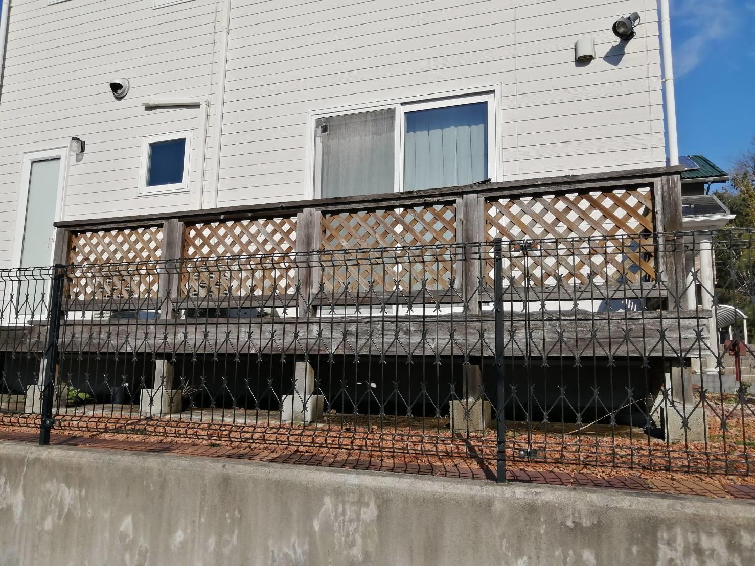 10数年間、雨風に耐え忍んできたウッドデッキ。 歩くのも気を遣うほど劣化されていたため、耐久性のあるデッキとテラスを新設させていただきました。