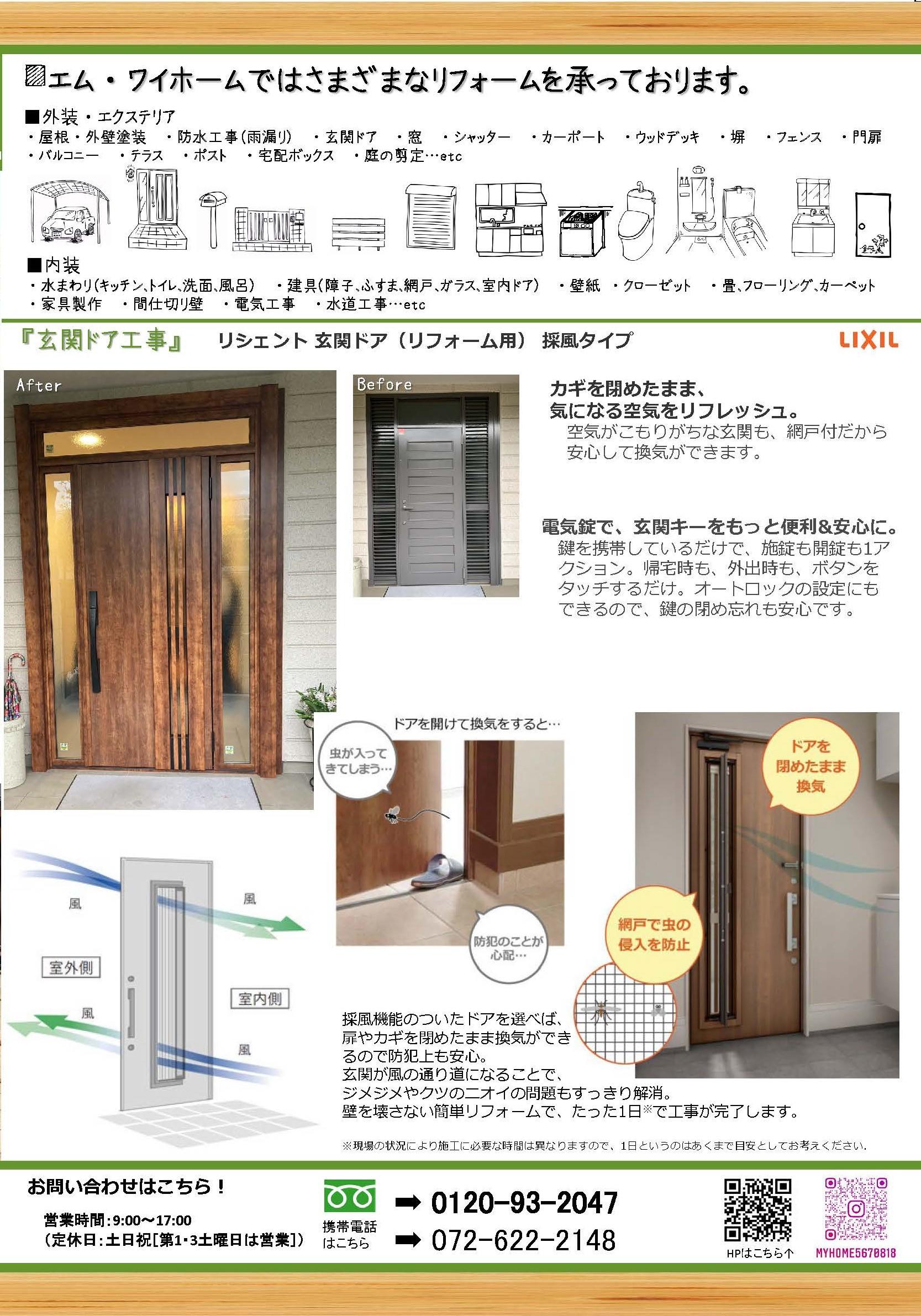 今月は補助金を利用しての玄関ドアのリフォーム工事のご紹介。お選びいただいたのは採風タイプ。ドアを閉めたまま換気もできます。