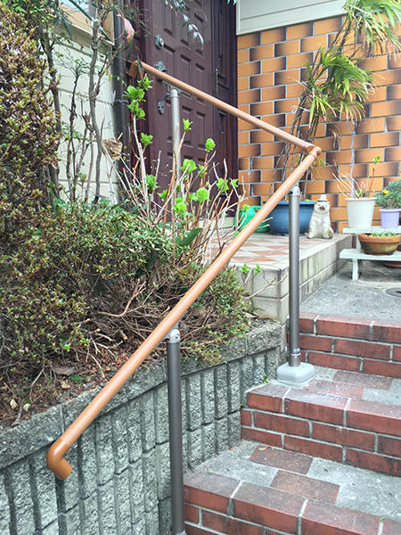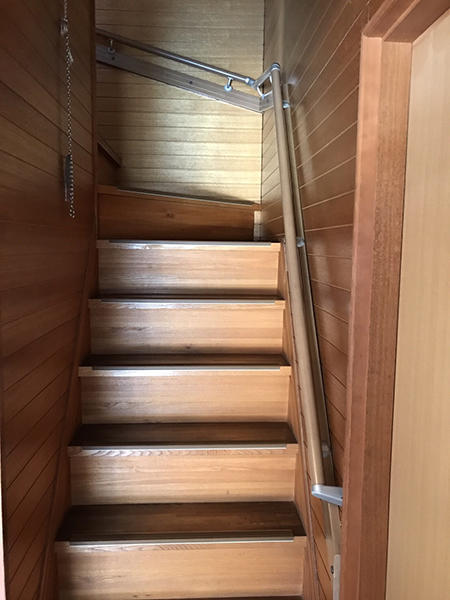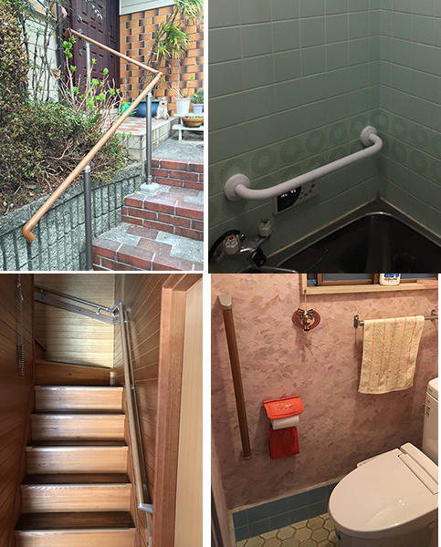 奥様の転倒をきっかけに、住居内(階段・お風呂・トイレ)と玄関アプローチに手すりを設置しました。階段には滑り止も施工しました。