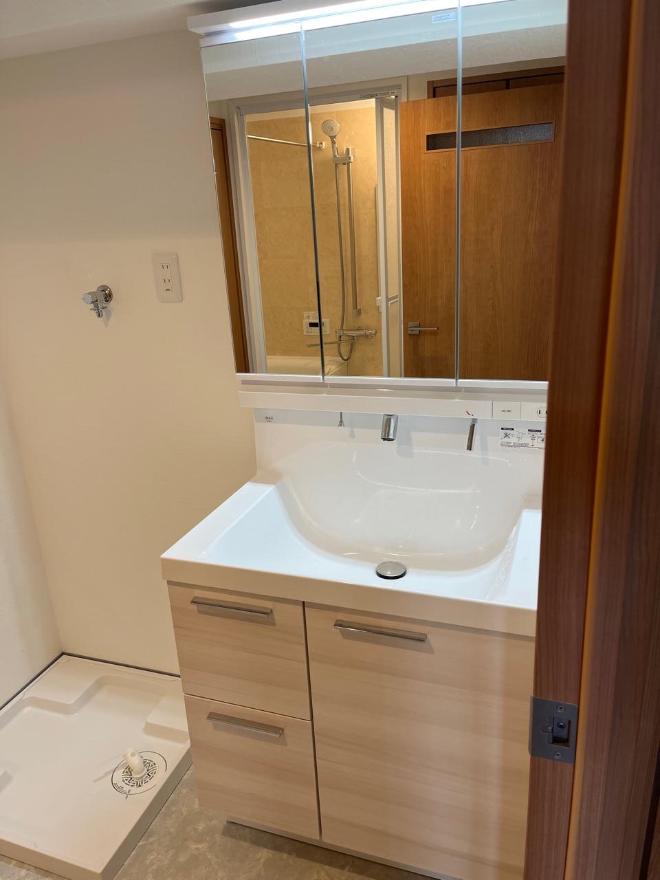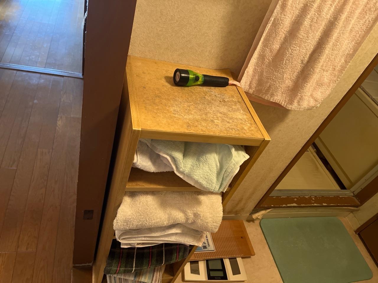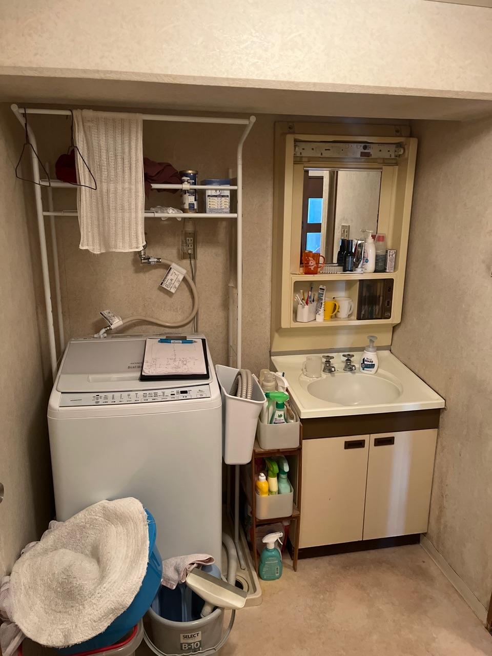 上部を扉付の衣類・タオル収納にし、下部は洗濯物を入れるかごを収納するスペースとしてフリーにして造作家具を施工。