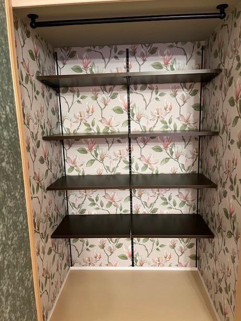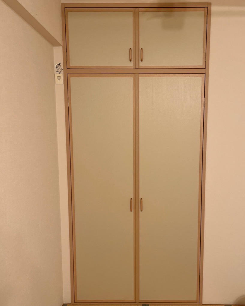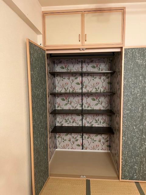 和室にある押入をクローゼットのような仕様へ変更。元々あった中段を撤去し、可動棚へ変更、洋服をかけるハンガーパイプを追加で付けました。 クローゼット内クロスはお客様にて選定。シンコールのBIGACEシリーズから。壁:BA6417 天井:BA6146