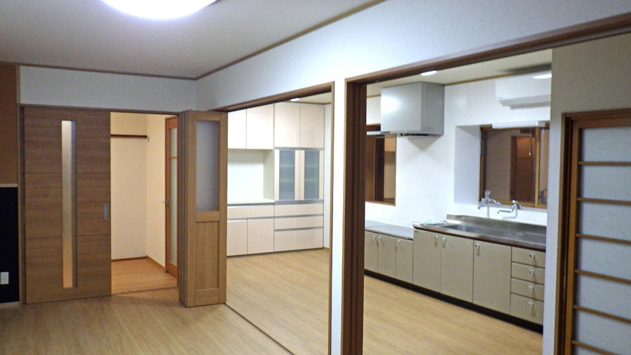 1階の居間と台所が暗い事に悩んでいたオーナー様 居間と台所の壁を取り折れ戸タイプにすることでリビングダイニングにリフォームしました。 キッチン側の窓から採光を取り入れて中庭を眺めることができます。 玄関ドア・窓・床をすべて断熱タイプにして夏は涼しく冬は暖かい仕様に施工いたしました。 可愛いお孫さん達がいつ来ても快適で安心の空間を実現しました。
