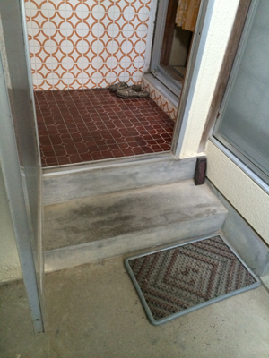 段差の昇降時の負担を軽くするため、勝手口土間の階段を一段増やすことで段差を軽減し、さらに手摺を取り付けた高齢者に優しいリフォーム事例です。