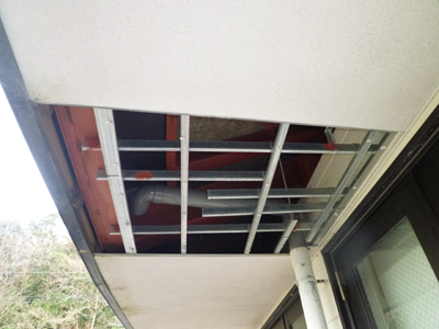 雨どいの水漏れにより軒天のケイカル板が落下してしまった為、張りなおしをした施工事例です。