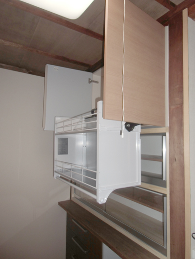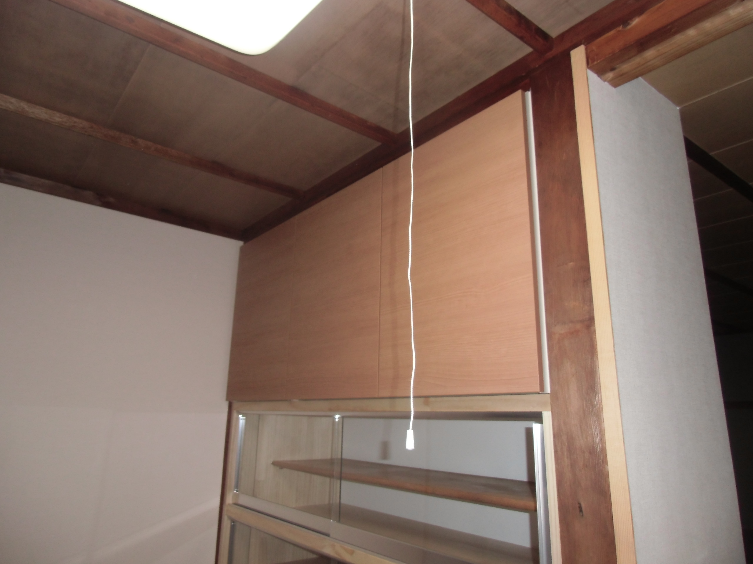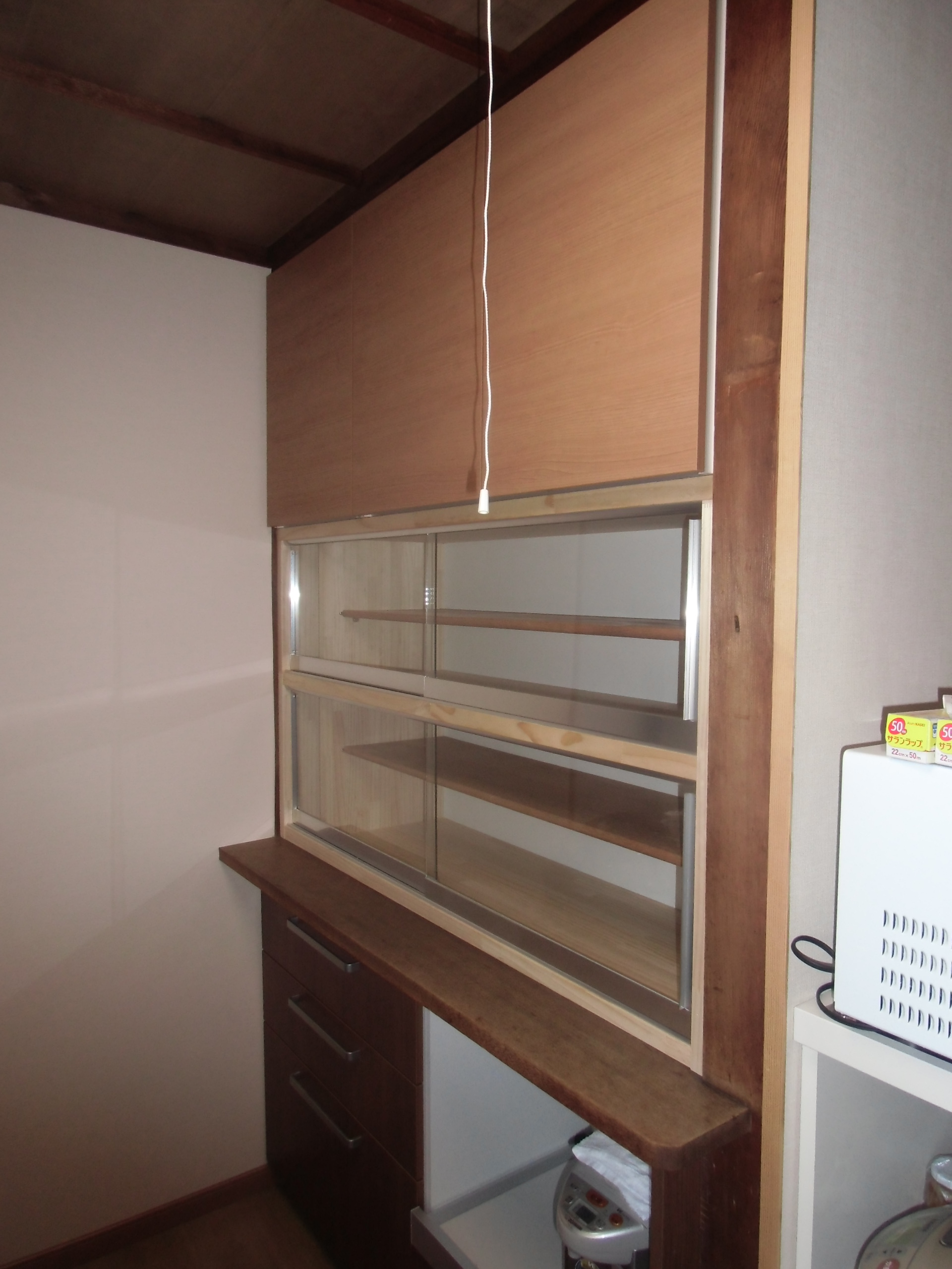 作り付けの食器棚(上部)を改修したリフォーム事例です。施主が高い所にも手が届くよう、ダウンウォールを付けました。