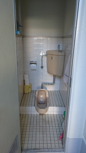 事務所外側の男女兼用和式トイレを洋式トイレへリフォームした事例です。清潔感と節水効果が期待されます。
