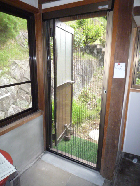 虫除け対策のために、勝手口の開きサッシドアに、ロール式網戸を取付けた施工事例です。