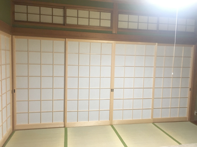 古くなった紙貼障子を貼り換え、修繕した施工事例です。破れにくいビニール繊維の入った紙を貼りました。