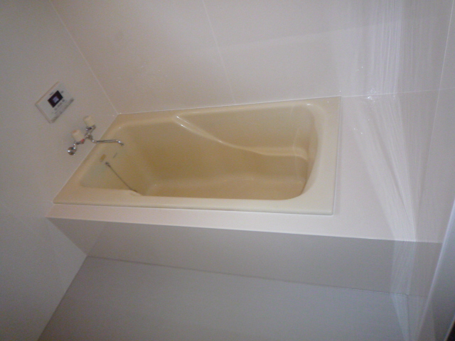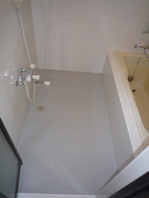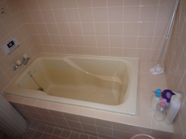 タイルの上に浴室用パネルを貼り、床タイルの上にシートを貼った施工事例です。浴槽と水栓金物はそのまま再利用しました。浴室のイメージが一新されました。