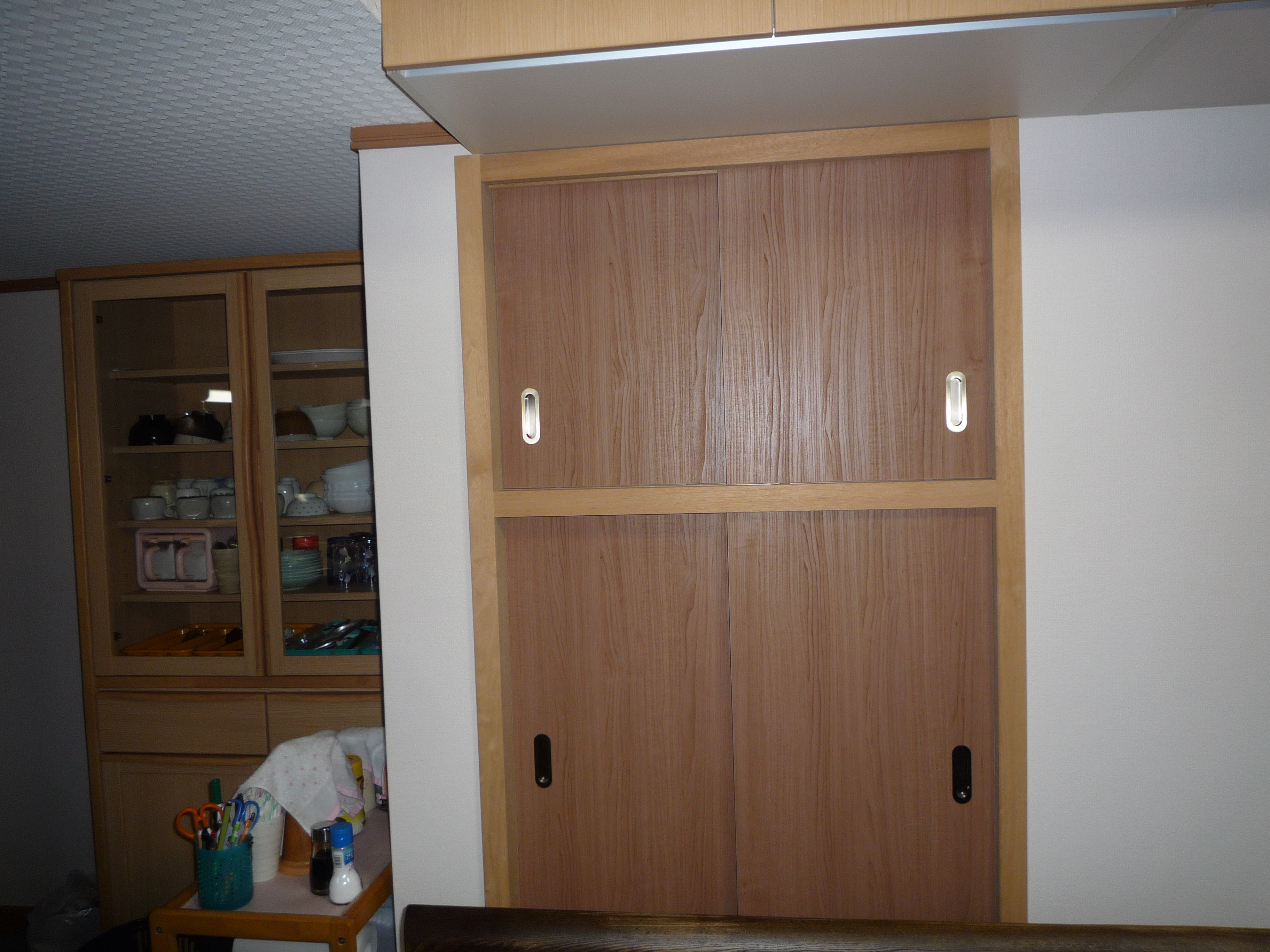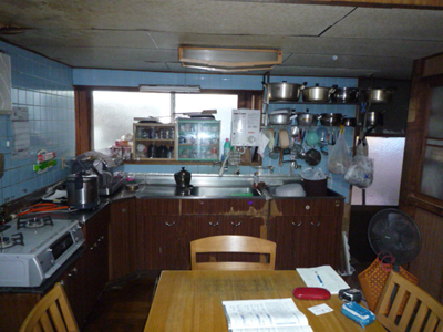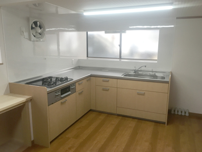 古くなった流し台からシステムキッチンに取り替えたキッチンのリフォーム事例です。同時に床・天井も貼り替えました。