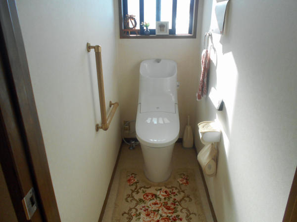 新築時より使い続けたトイレが古く感じられたため、省エネ・メンテナンス性・デザインを考慮して新しくした施工事例です。合わせて手すりをL字型に取付て立ち座りの負担を軽減した人に優しいリフォーム事例です。