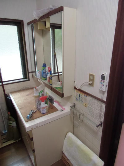 古くなって使っていなかった洗面台(オフト)を取替した施工事例です。間口を750から600にすることで、隣に洗濯機設置スペースができました。
