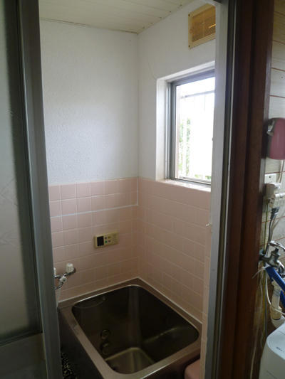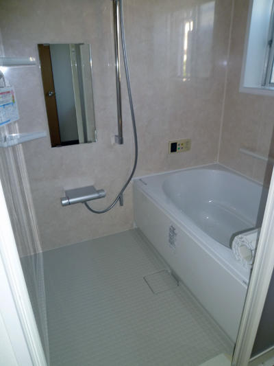 在来浴室からユニットバスへの施工事例です。出入り口を開口の大きな片引き戸にしました。