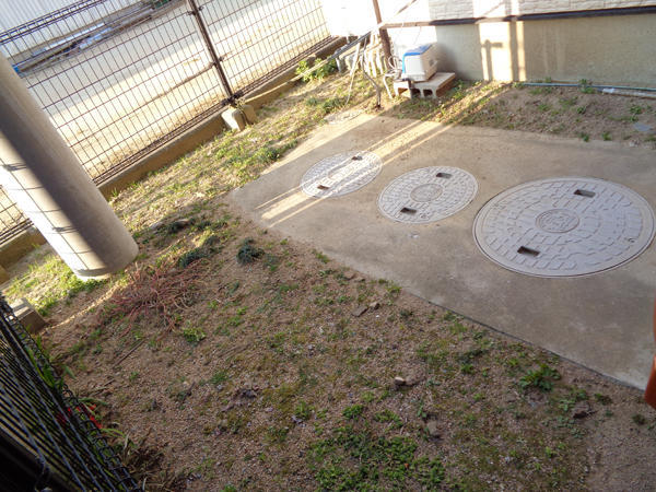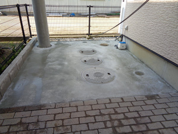 浄化槽まわりの土を撤去しコンクリート(鉄筋入り)を施工しました。草生えもなく、車を駐車できます。また、土が流れ込まない様ブロックと砕石敷で対策しました。