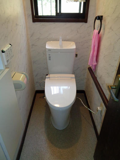1階トイレを交換しました。リクシル独自のAQUA CERAMIC(100年相当の耐久)素材の便器を使用しているのでよごれが付きにくく、お掃除が非常に簡単になりました。また超節水型なのでエコで経済的です。