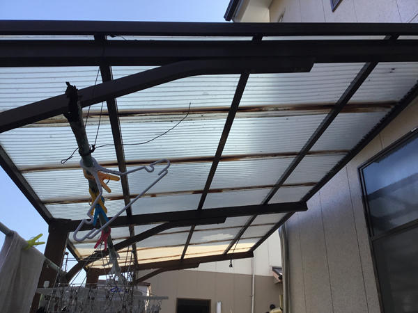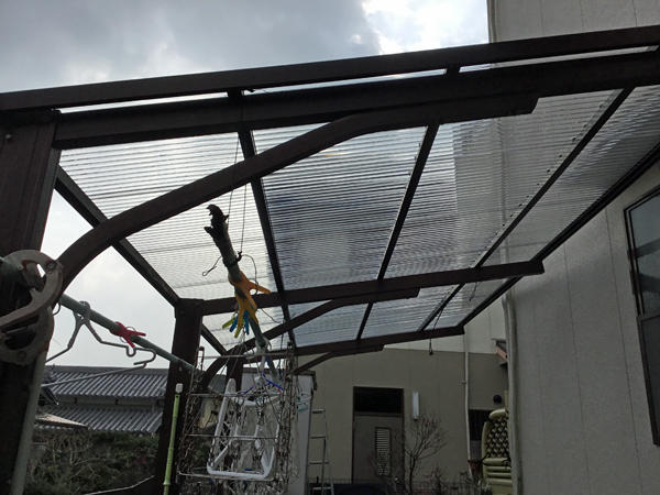 猫が2階から飛び降り、ポリカに穴が空いた為新しい物に貼り替えたリフォーム事例です。