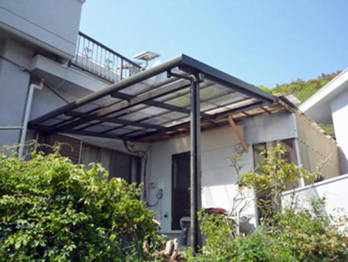 古くなった樹脂製の波板囲いを丈夫なアルミ製のテラスに取替えました。風当たりが強い場所なので補強材も入れました。