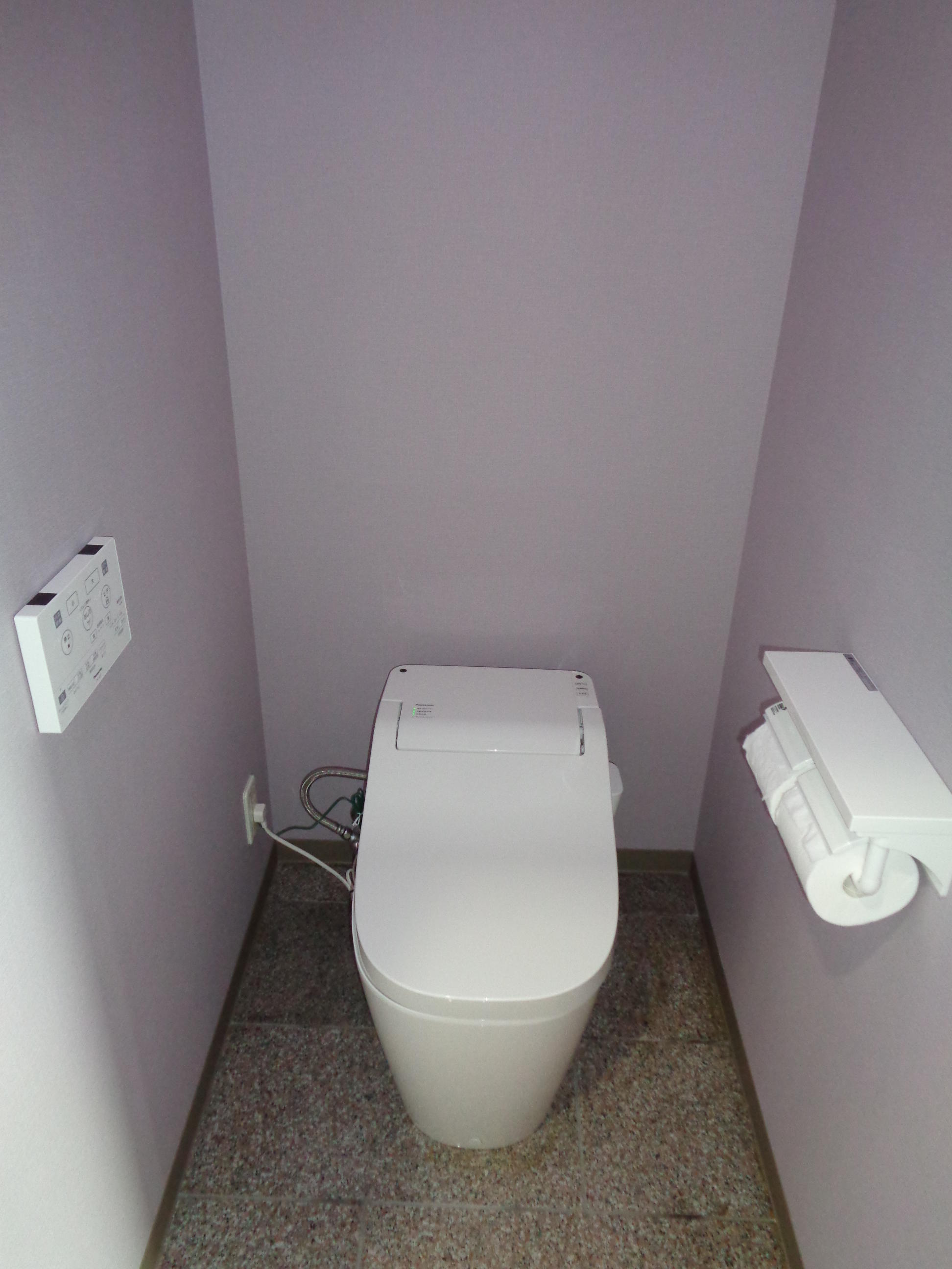 トイレ便器を交換し、クロスを貼替ました。便器のサイドポケットに中性洗剤を入れることにより、排水時の洗浄力がアップし抗菌作用が保たれいつでも清潔にご使用できます。