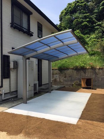 庭の開いているスペースに新しく設置したカーポートの施工事例です。建物の外壁にあったデザインのカーポート、車にこもる熱を緩和するため熱線吸収ポリカを使用しました。駐車場の土間コンクリートは、雨の日、洗車の時に助かりますね。