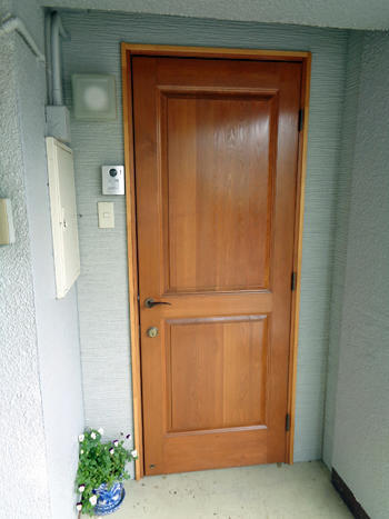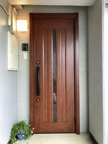 木製ドアをカバー工法でアルミ製玄関ドアに交換しました。以前はガラス部分がなく、光が入らず暗かったのですが改善されました。また木目調の柄にしたので重厚感ある玄関になりました。