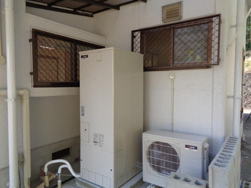風呂釜と給湯専用ボイラーの組合せだったのをエコキュートに交換した事例です。灯油を入れる手間がなくなり、オール電化にしたので経済的になりました。