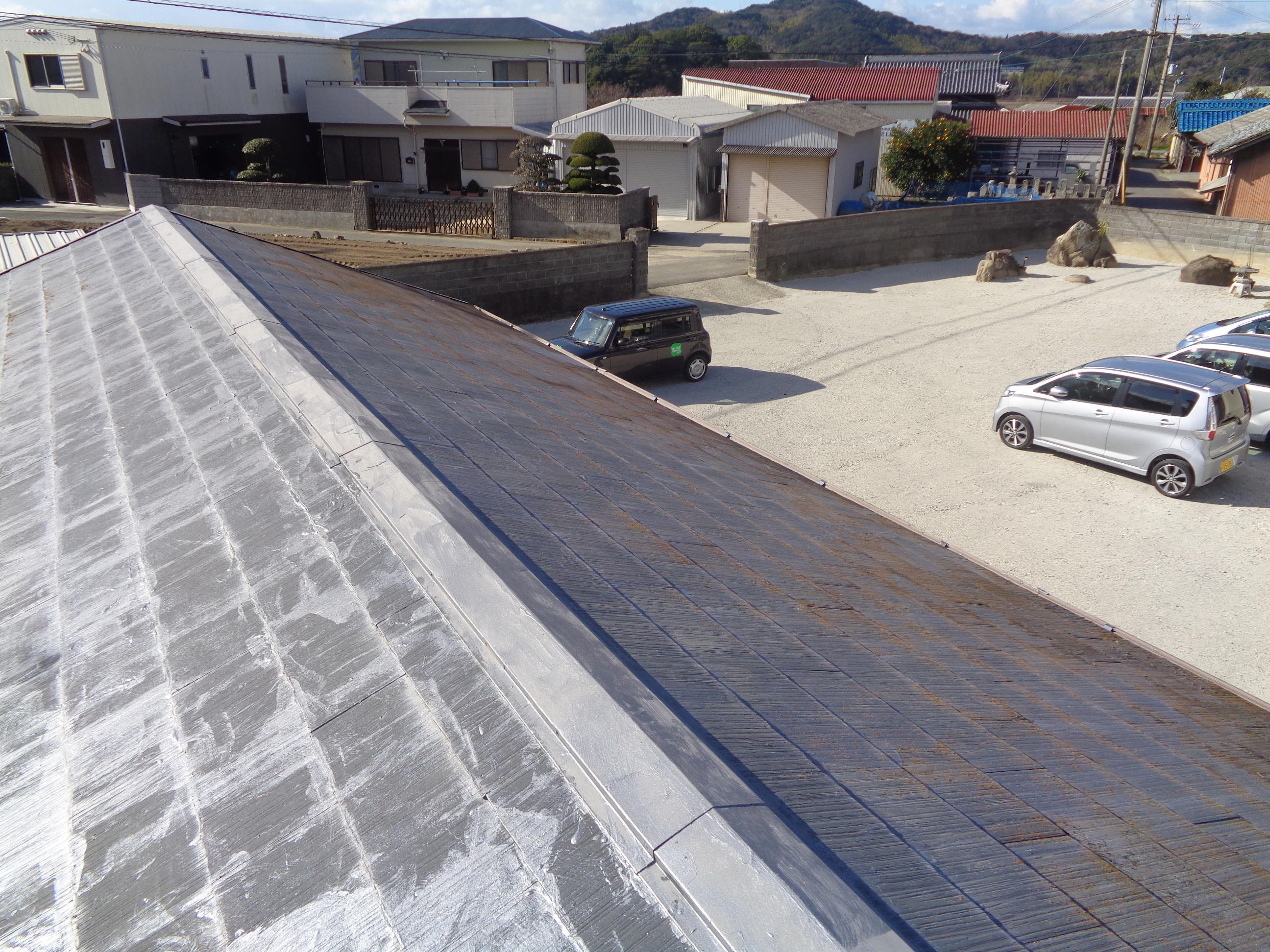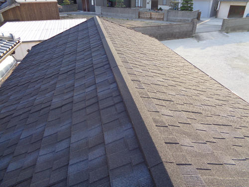スレート屋根が色褪せて苔が生えてきたということでTルーフによるカバー工法を施工した事例です。基材がガルバリウム鋼板で耐食性に優れており、表面に天然石の粒子をコーティングしているので急激な温度変化に対応でき経年による退色の不安も軽減できます。なにより軽い(単位面積あたり瓦の約1/7、スレートの約1/3の重量)ので地震にも安心です。
