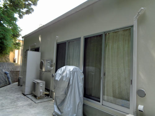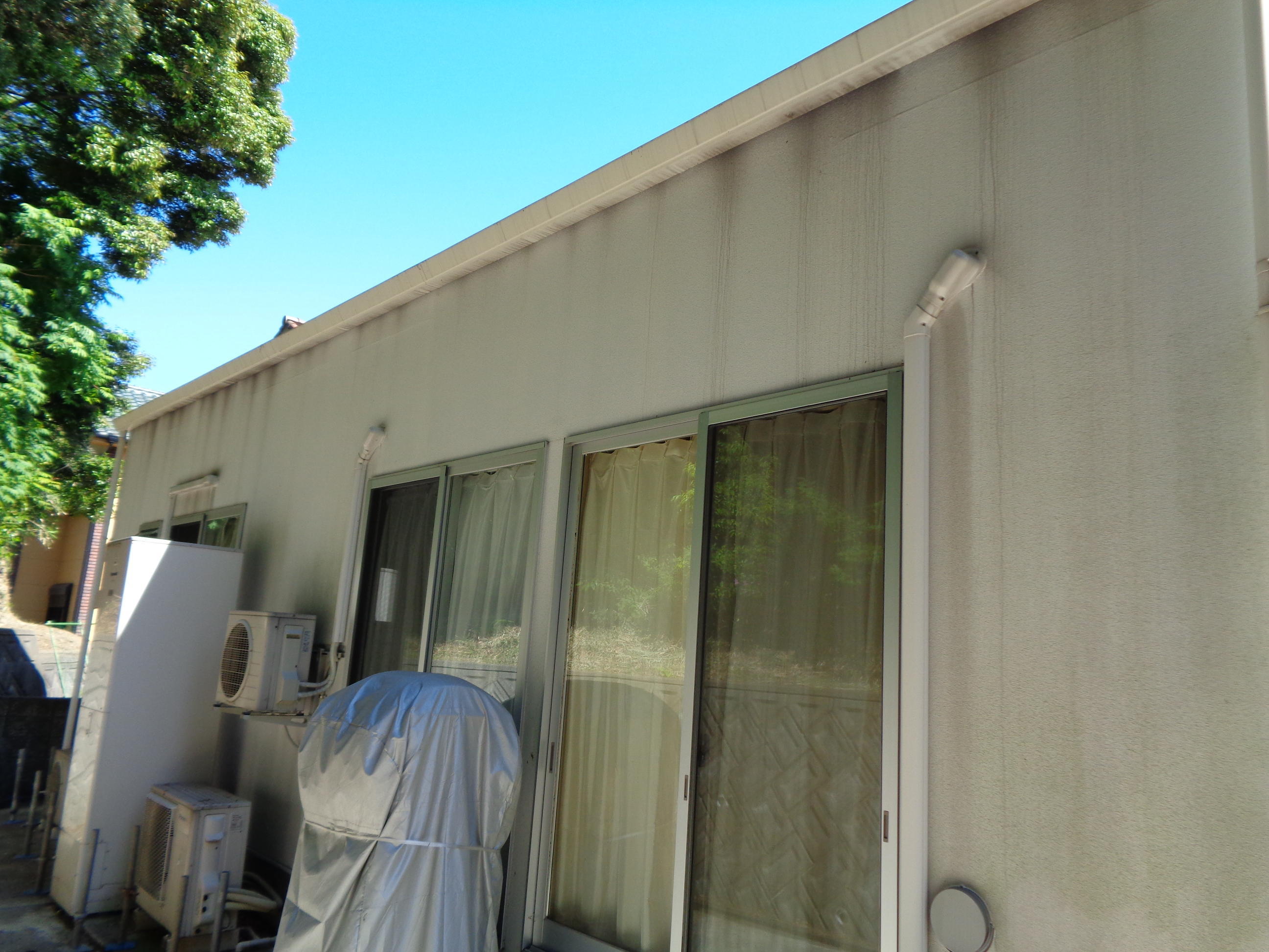 既存外壁リシン面にかび・藻が発生。リシン面に汚れがたまり雨たれが発生していたが、低汚染型セラミック変性塗膜により雨水が汚れの下を通過して汚れを浮かし流れるため艶のある美観を長期にわたり維持します。さらに防カビ・防藻性があるのでそれらの繁殖をおさえます。