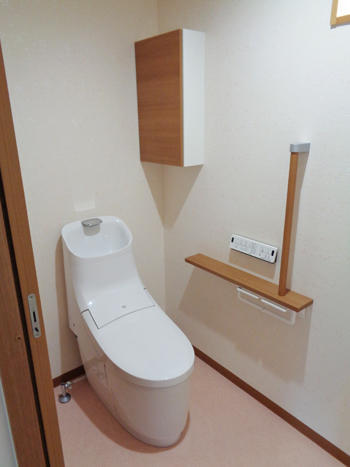 1階トイレを拡張し器具を交換した事例です。リクシル独自のAQUA CERAMIC(100年相当の耐久)素材の便器を使用しているのでよごれが付きにくく、お掃除が非常に簡単になりました。また収納や手摺も取付けたので使い勝手も良くなりました。