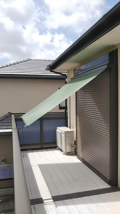 強い日差しを遮る為に取り付けました。窓を開けて風を取り入れる事も出来るようにベランダ手すりに斜めに取り付けました。暑さをスッキリ、窓辺もスッキリできるLIXIL≪スタイルシェード≫で視線対策もバッチリ、色あせ・劣化を抑えて耐久性もしっかり、お掃除もメンテナンスもラクラクできます。