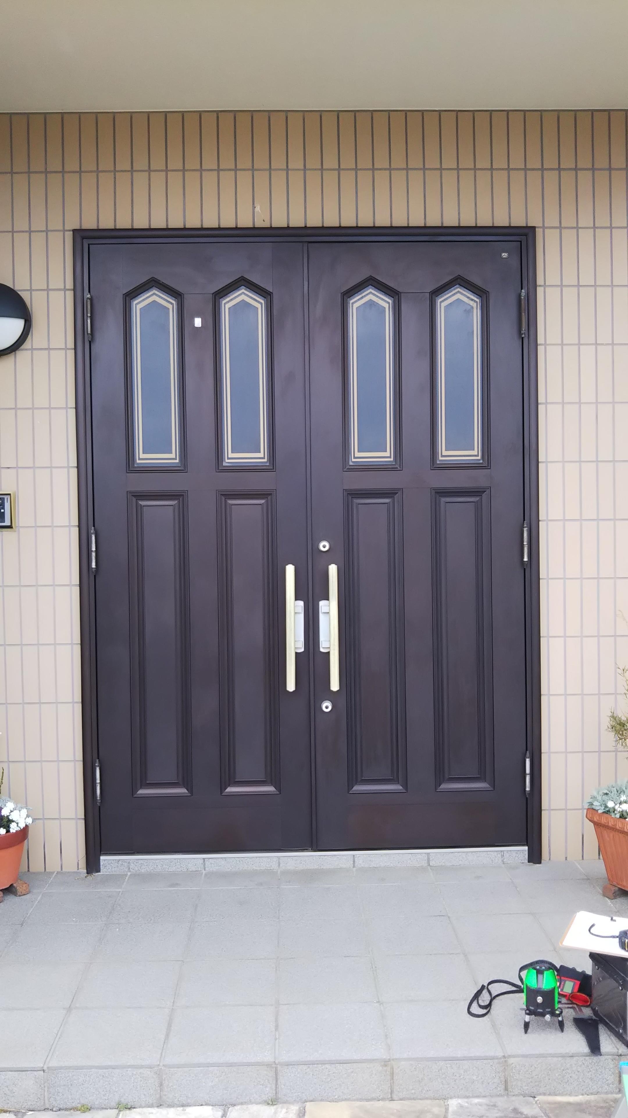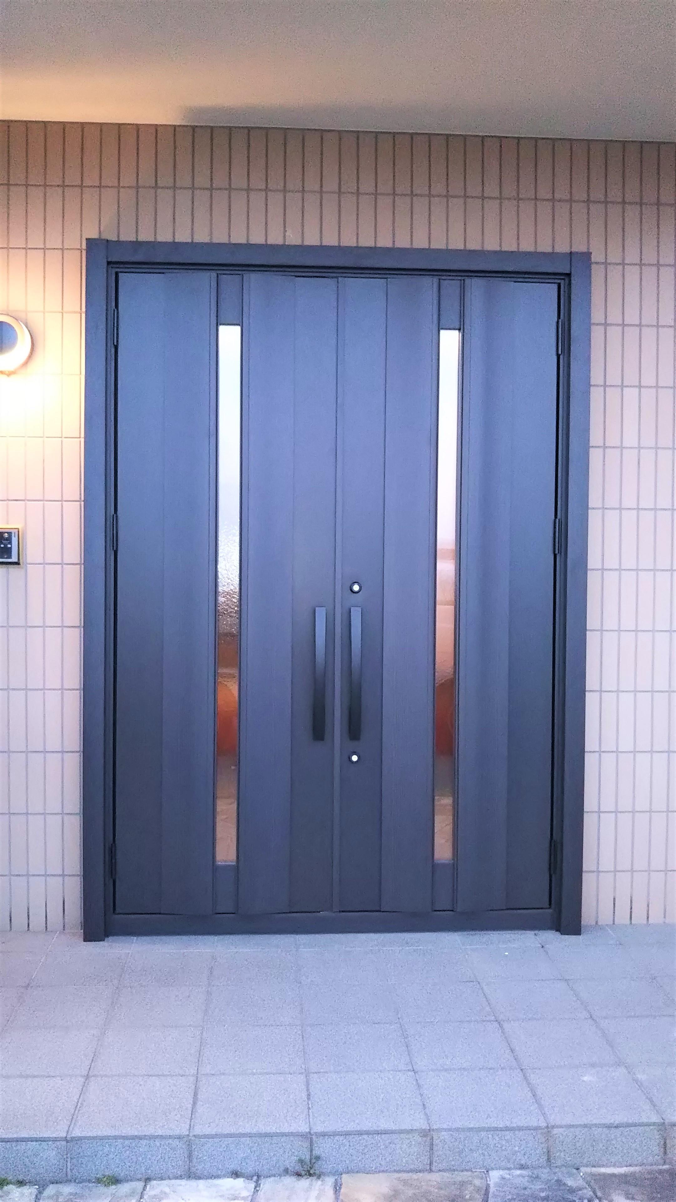 もともと重厚感がある両開きの玄関扉でしたが、経年劣化により表面材が色褪せてきたため、リフォーム用玄関扉リシェントでリフォームをしました。 立体感のあるモールデザインと落ち着いたトーンのダークカラーが重厚な外壁にマッチして、新しい家の顔として息を吹き返しました。