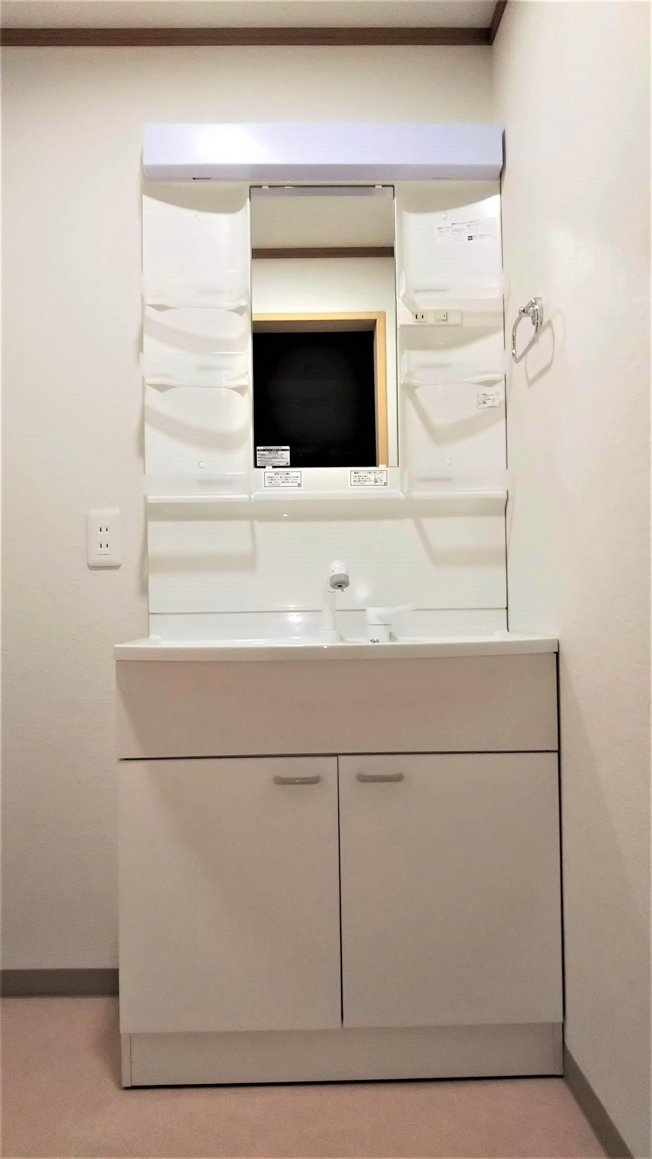 古くなった洗面化粧台取替の施工事例です。 同時にクロス・クッションフロアも貼替ました。