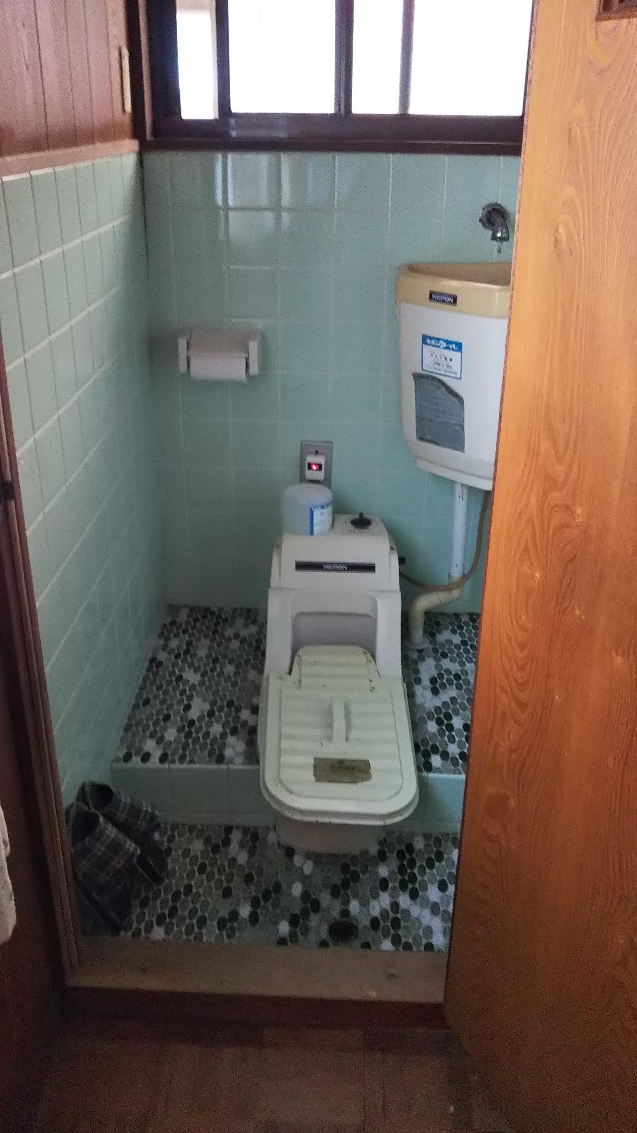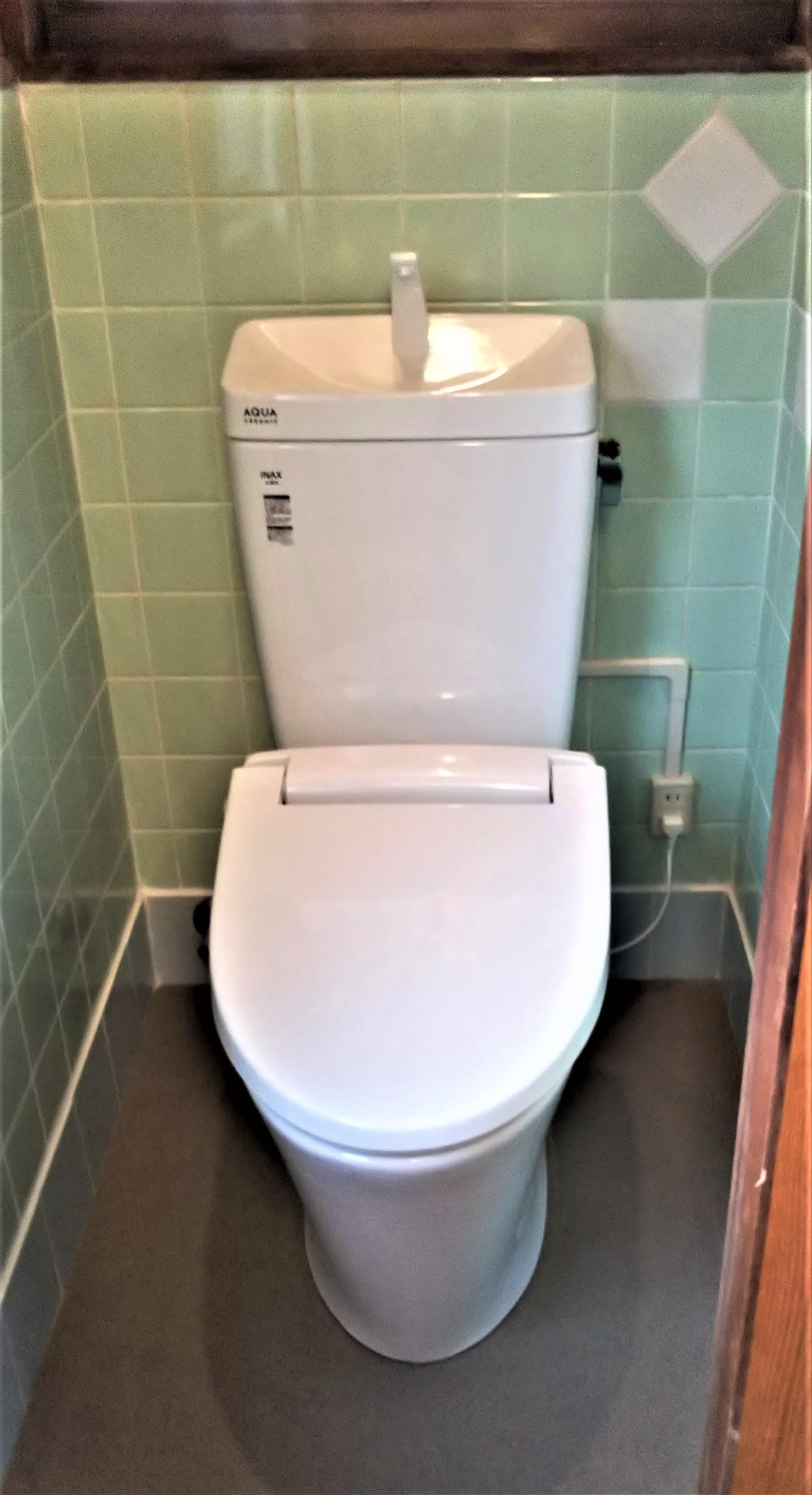 下水道引き込み工事とトイレの和式から洋式に変え、段差解消工事を行いました。床はクッションフロア張り、壁のタイルは修繕をしました。 同じ色のタイル、大きさのものは廃盤でありませんが、アクセントに色と大きさを変えて修繕しました。