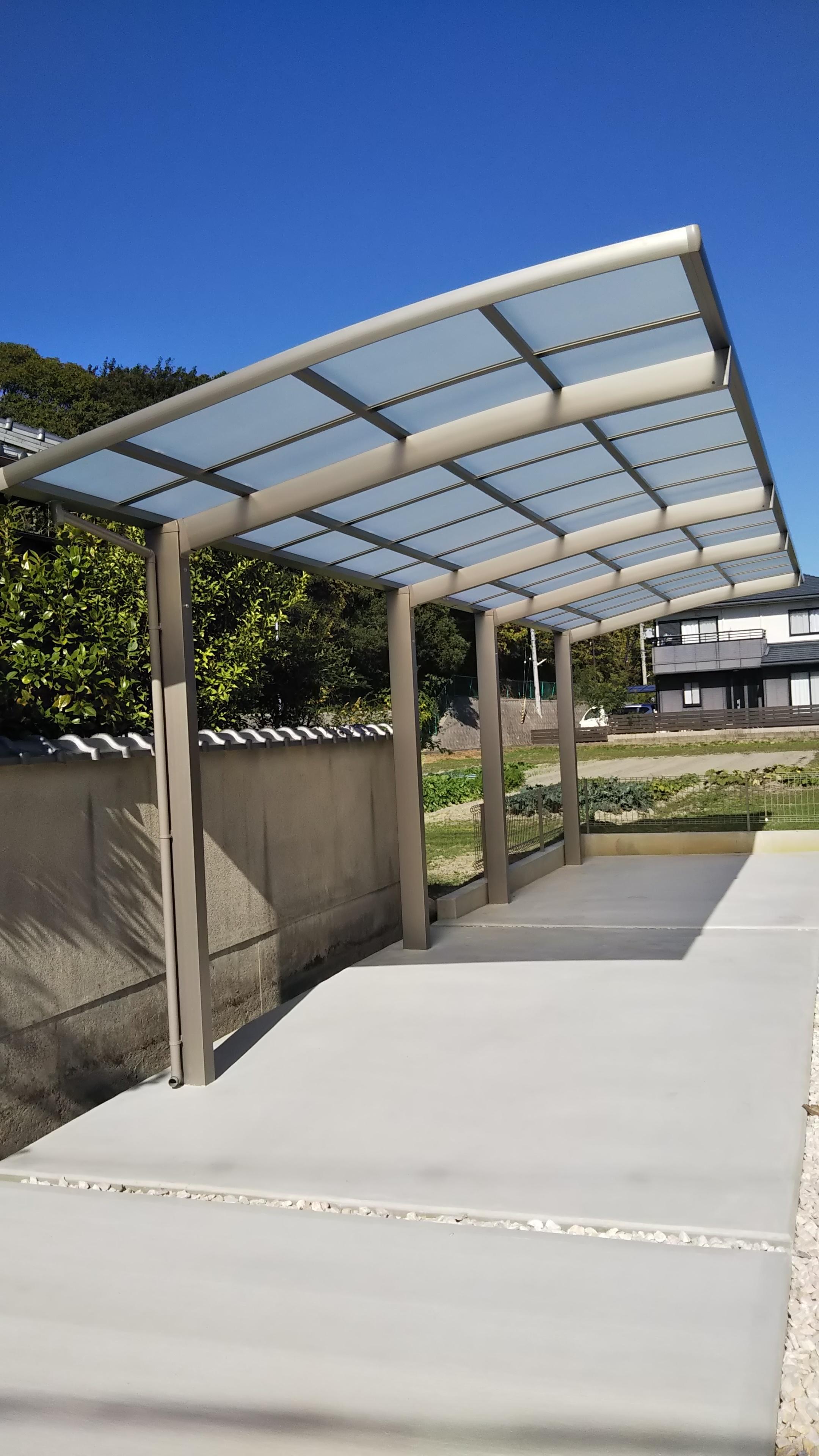 新築の外構工事。床は土間コンクリート仕上げ、ところどころにレンガでアクセントを入れました。一部に土のコーナーがあり、小さなお子様のお遊びコーナーになっています。 カーポートは、たて2連棟で奥行ある敷地にはすっきり収まっています。