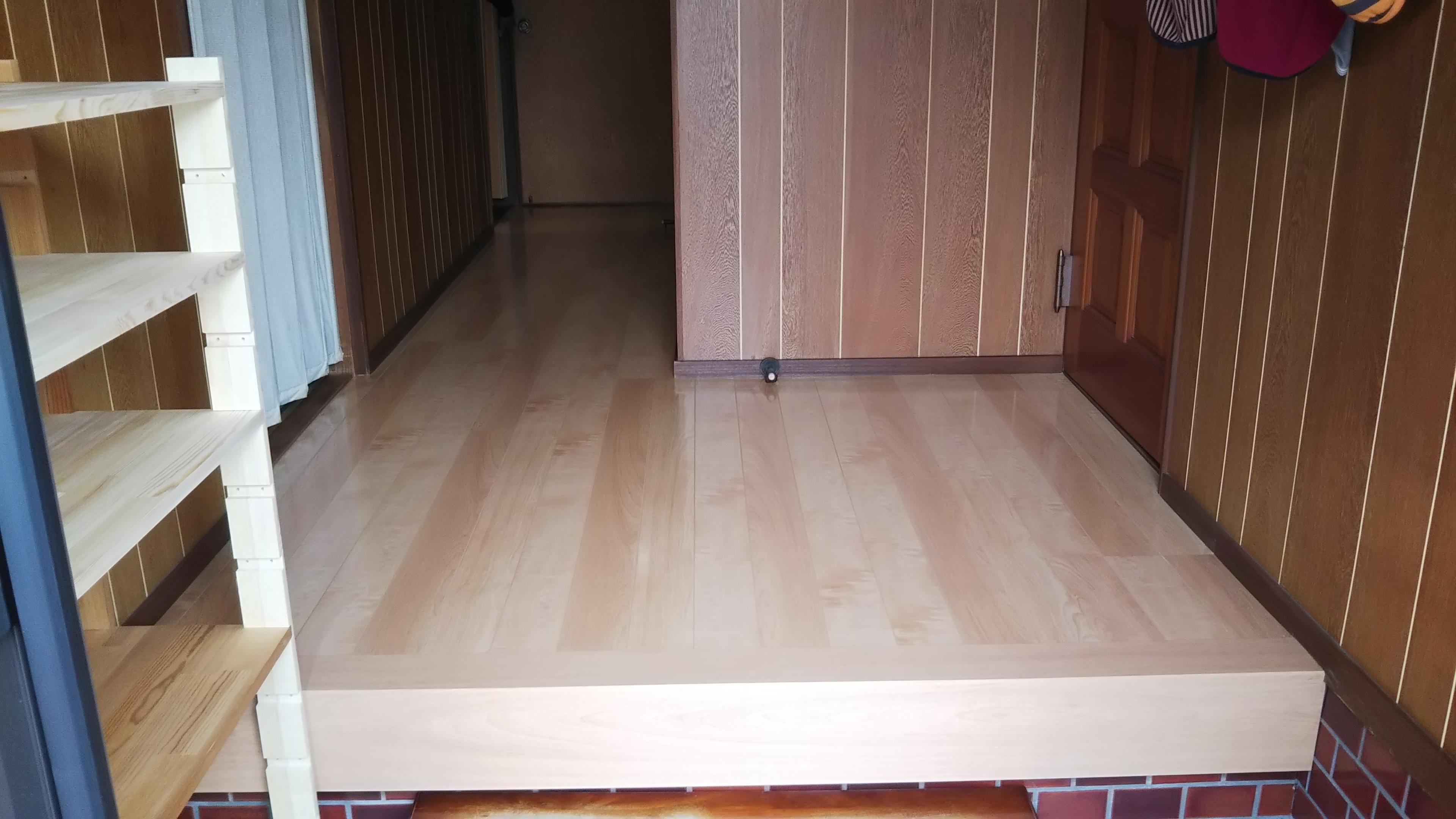 廊下床がところどころふわふわし始めていたため、既製品のフローリングを重ね貼りした事例です。 凹みにくく擦り傷が付きにくい床材なので、車椅子やキャスターに強く、汚れも落としやすくワックス不要なのでお手入れも簡単です。床材の色味も薄く色づいていて優しい雰囲気を醸し出しています。