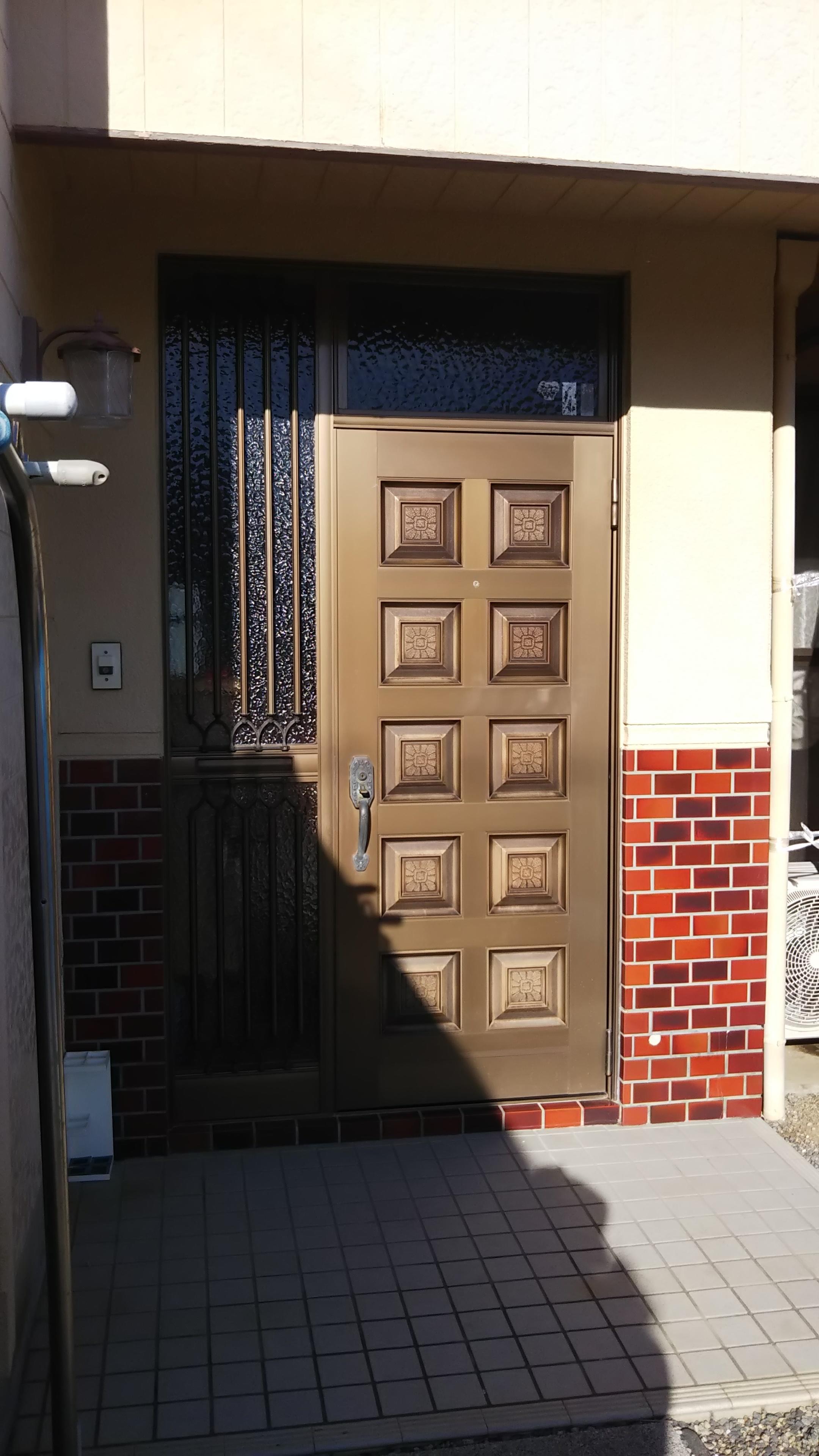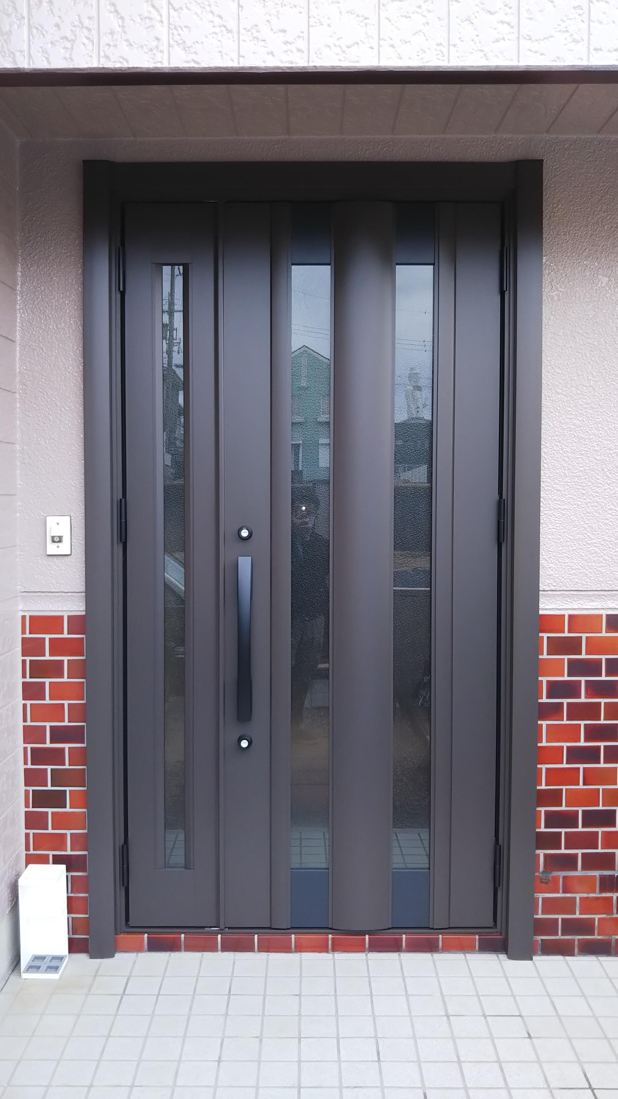 不具合等はまだありませんでしたが、この建物を新築した当時のままの玄関扉だったため外壁塗装に併せて玄関扉も新しくした事例です。 暗くなりがちな玄関も、扉の大開口デザインで自然光が上から足元もとまで入り子扉でも採光が採り込める明るい玄関になりました。ハンドル部分も握って開けることなく、引くだけでサッと開けることができるから、家族みんなに使いやすいバーハンドルです。
