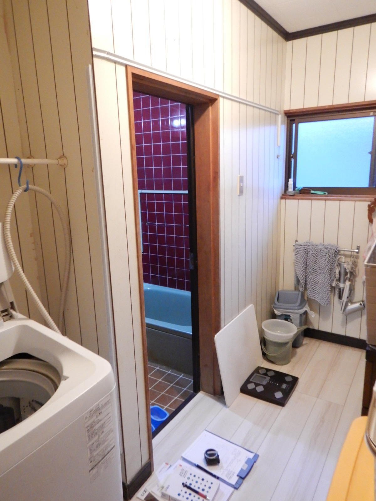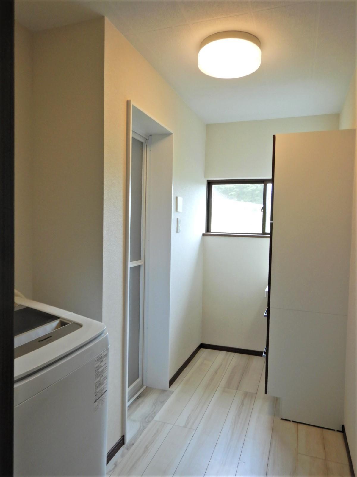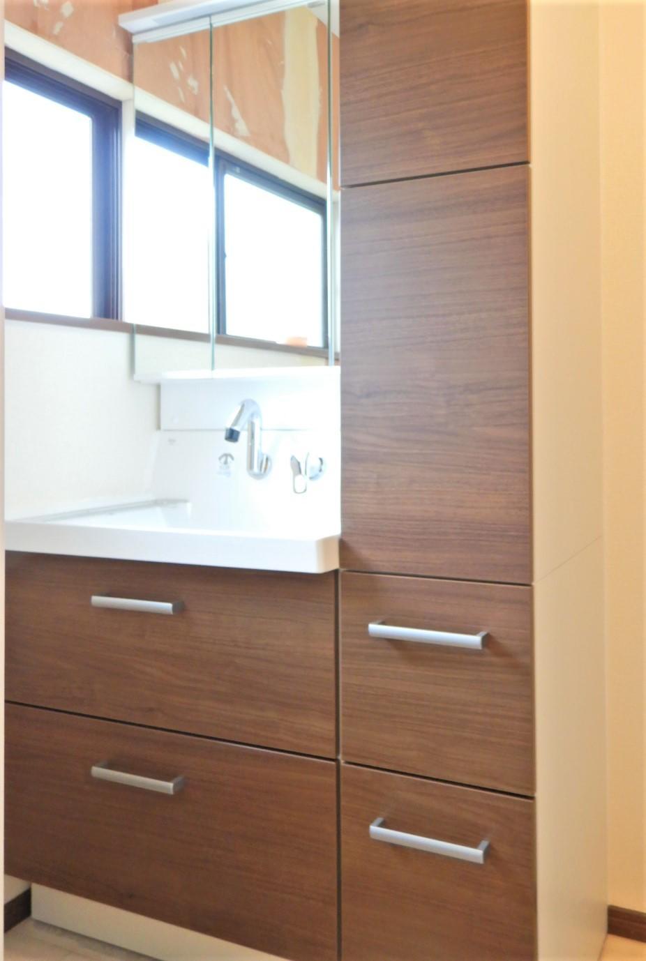浴室リフォームに伴い、洗面所もリフォームした施工事例です。 壁のクロスをホワイトにしたので、とても明るくなりました。 また、洗面化粧台まわりの小物類やタオル類、洗剤等のストック用品もたくさん収納できるトールキャビネットをご採用いただいたことにより、脱衣所全体がスッキリした印象になりました。