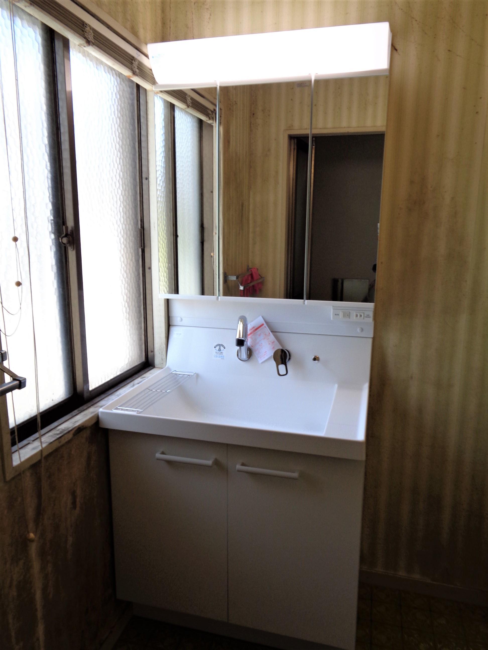 古くなった洗面台を交換した事例です。 朝の身支度で使う小物類や洗剤のストックなど、意外と物が多くなってしまう洗面台周辺。 三面鏡の鏡扉の裏はすべて収納スペースになっているので、メイク道具や整髪剤などのこまごました物もスッキリ収納することができます。