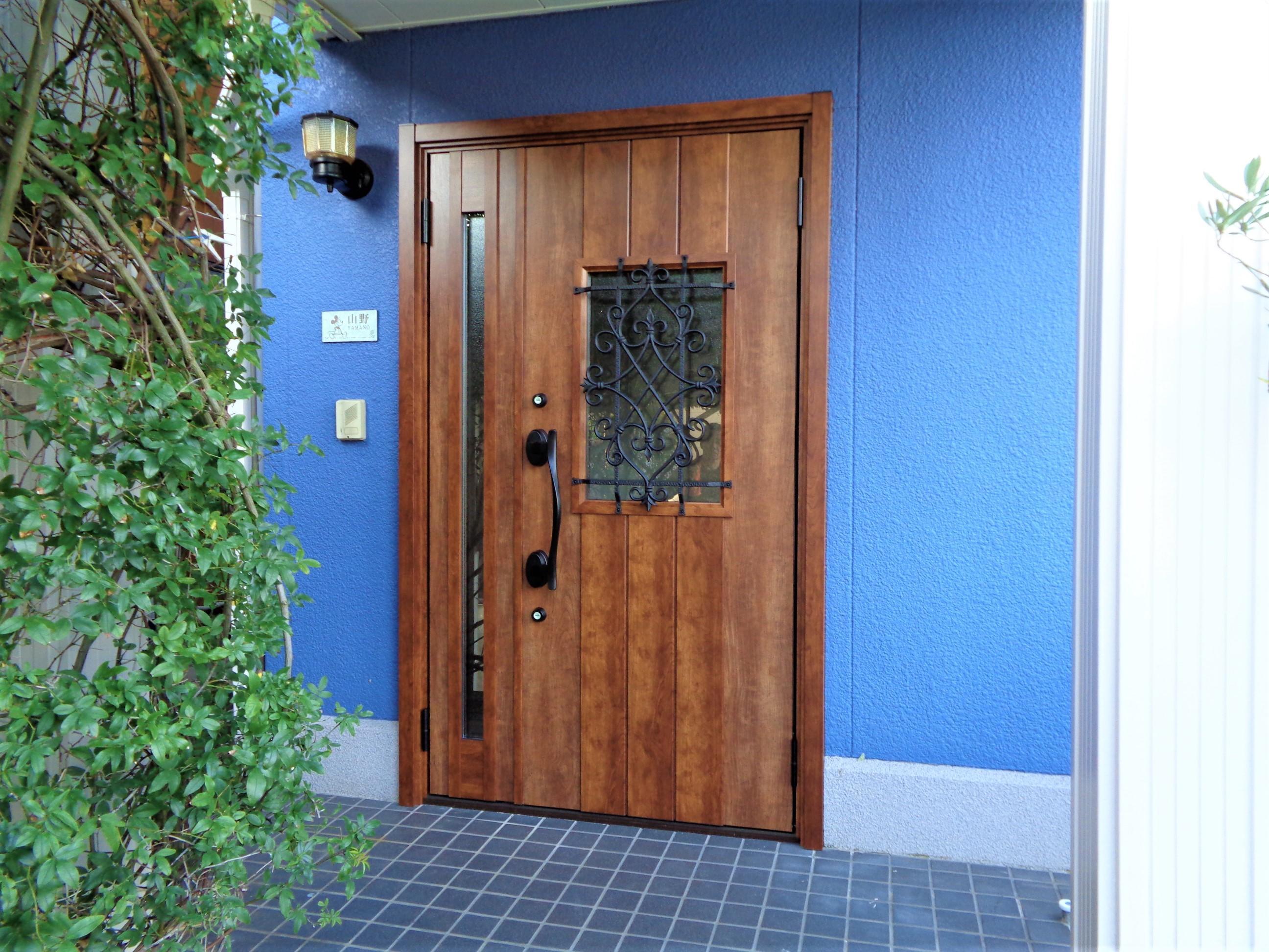 古くなった玄関ドアをカバー工法にて交換した事例です。木目調でアイアンの格子が映えるオシャレな玄関になりました。 【LIXIL リシェント】シリーズならば、1日で玄関を美しく一新できます。 しかも、豊富なバリエーションで今の住まいやこだわりに合わせて選べます。