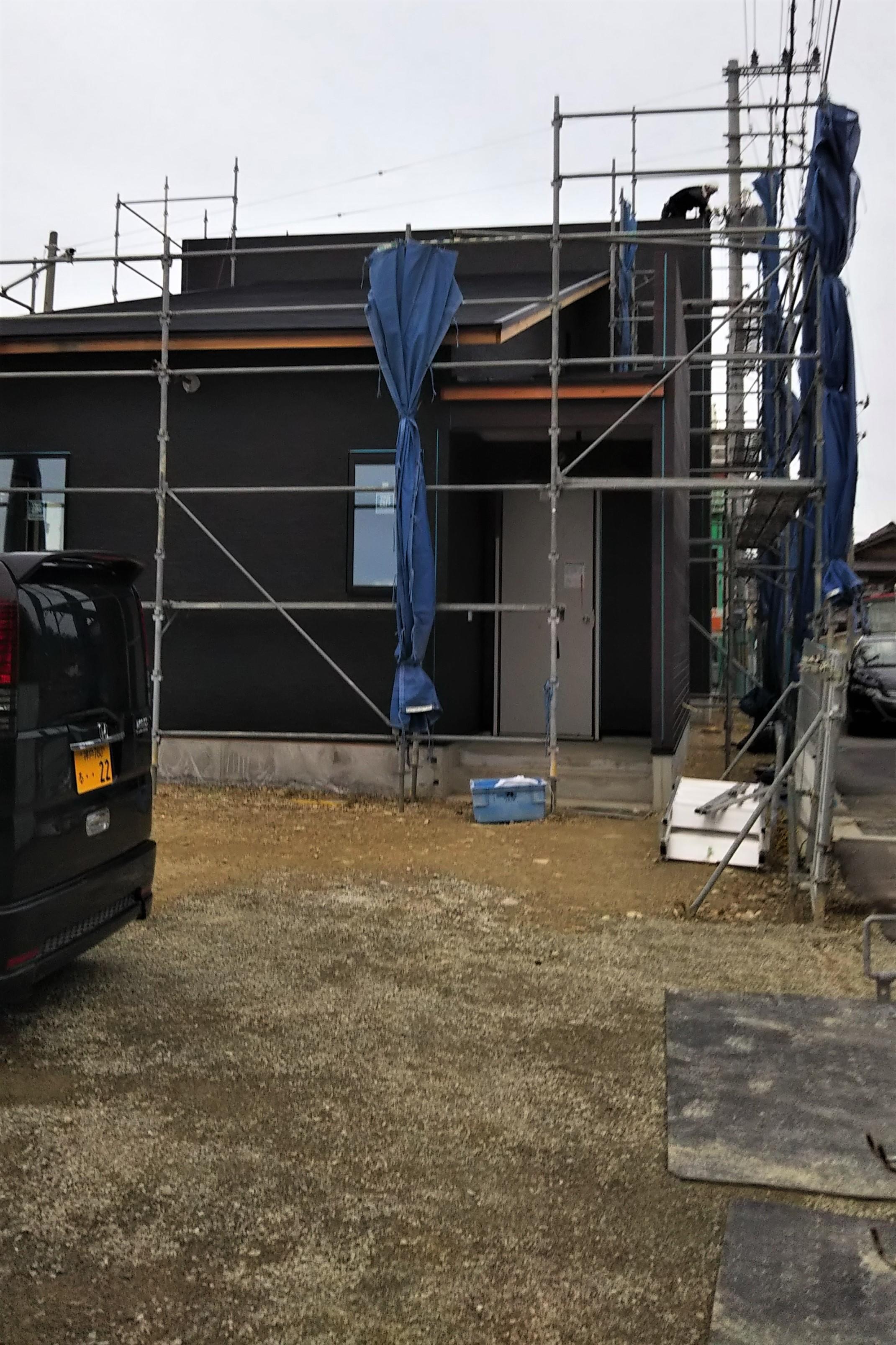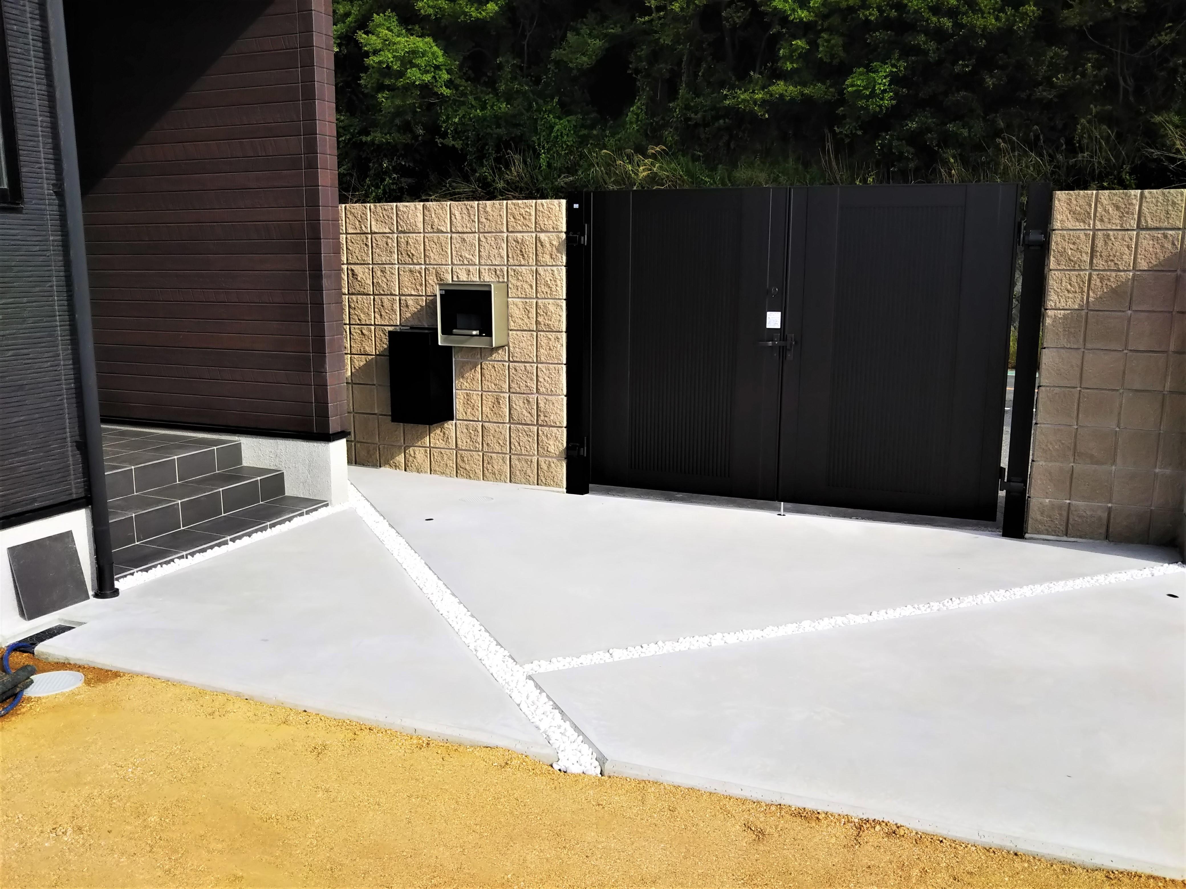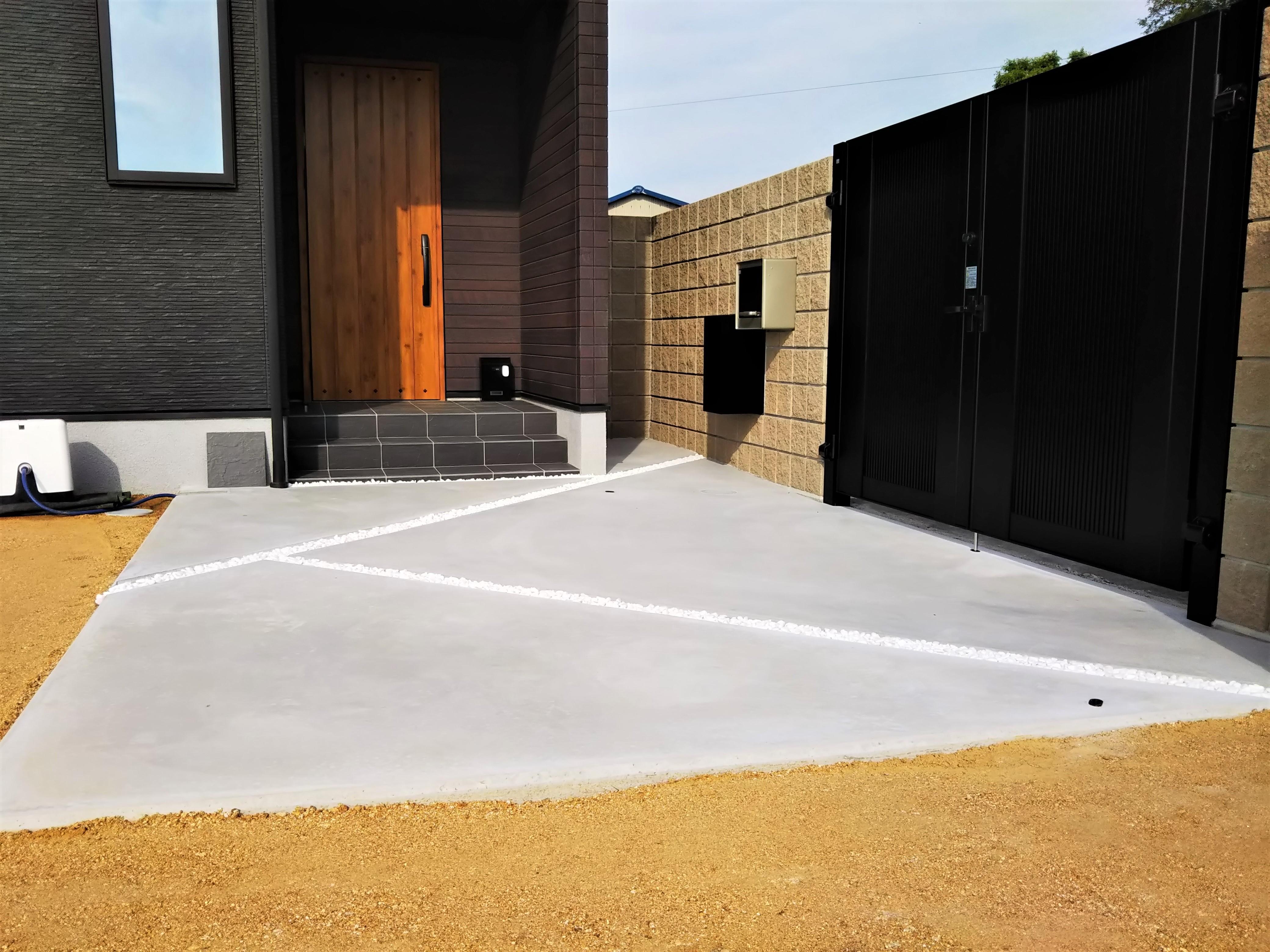 新築の外構工事です。アプローチは、車1台分が入るスペースを土間コンクリート打ちとして、目地デザインを斜めに入れ、白玉石を敷き詰めました。建物の外観が黒がベースになっているので、モノトーンでまとめました。