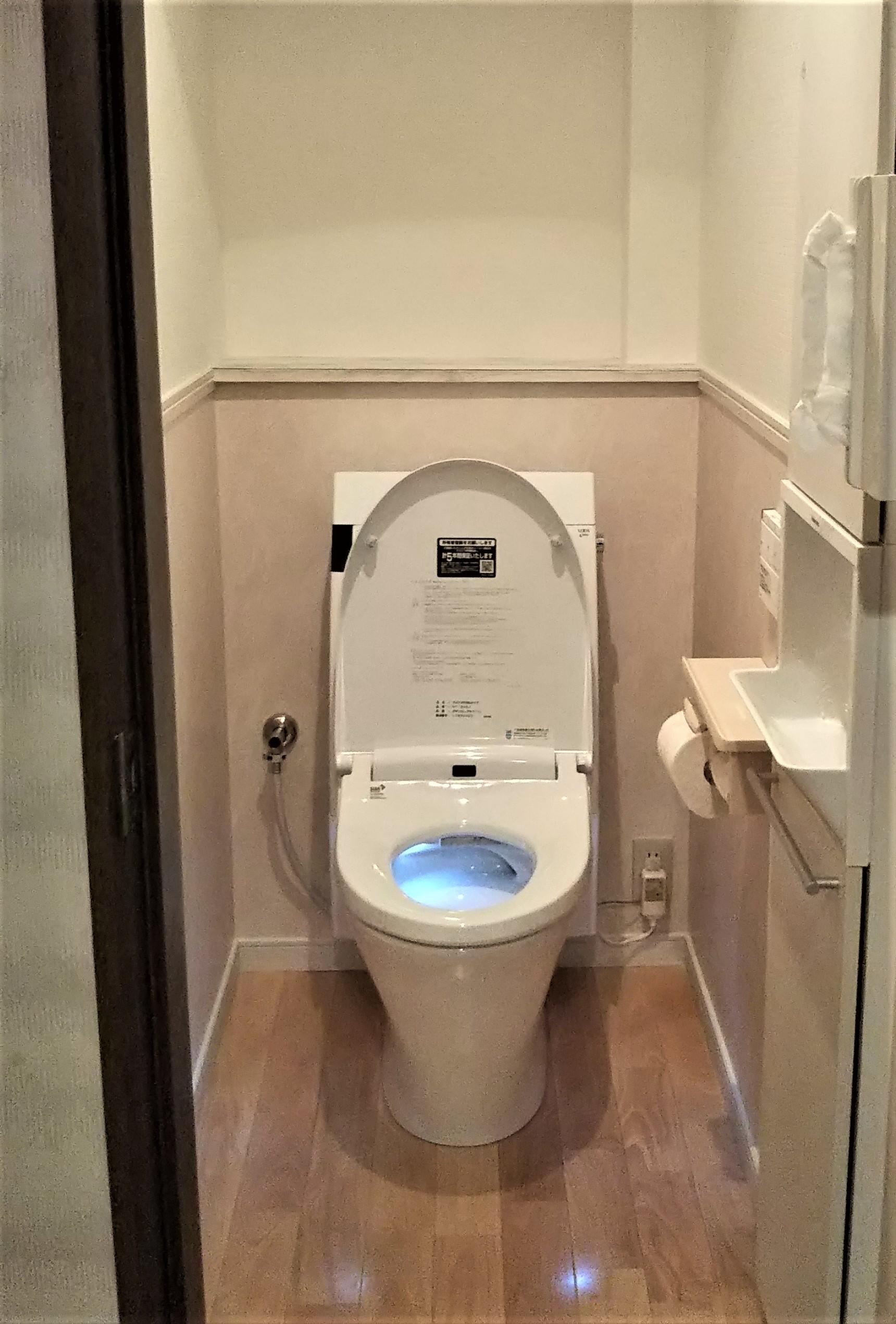 経年劣化により床が抜けそうになっていたため、フローリングは無垢のサクラ、壁は腰下をサニタリーパネル、腰上はクロス、便器は新しいものに取り替えました。