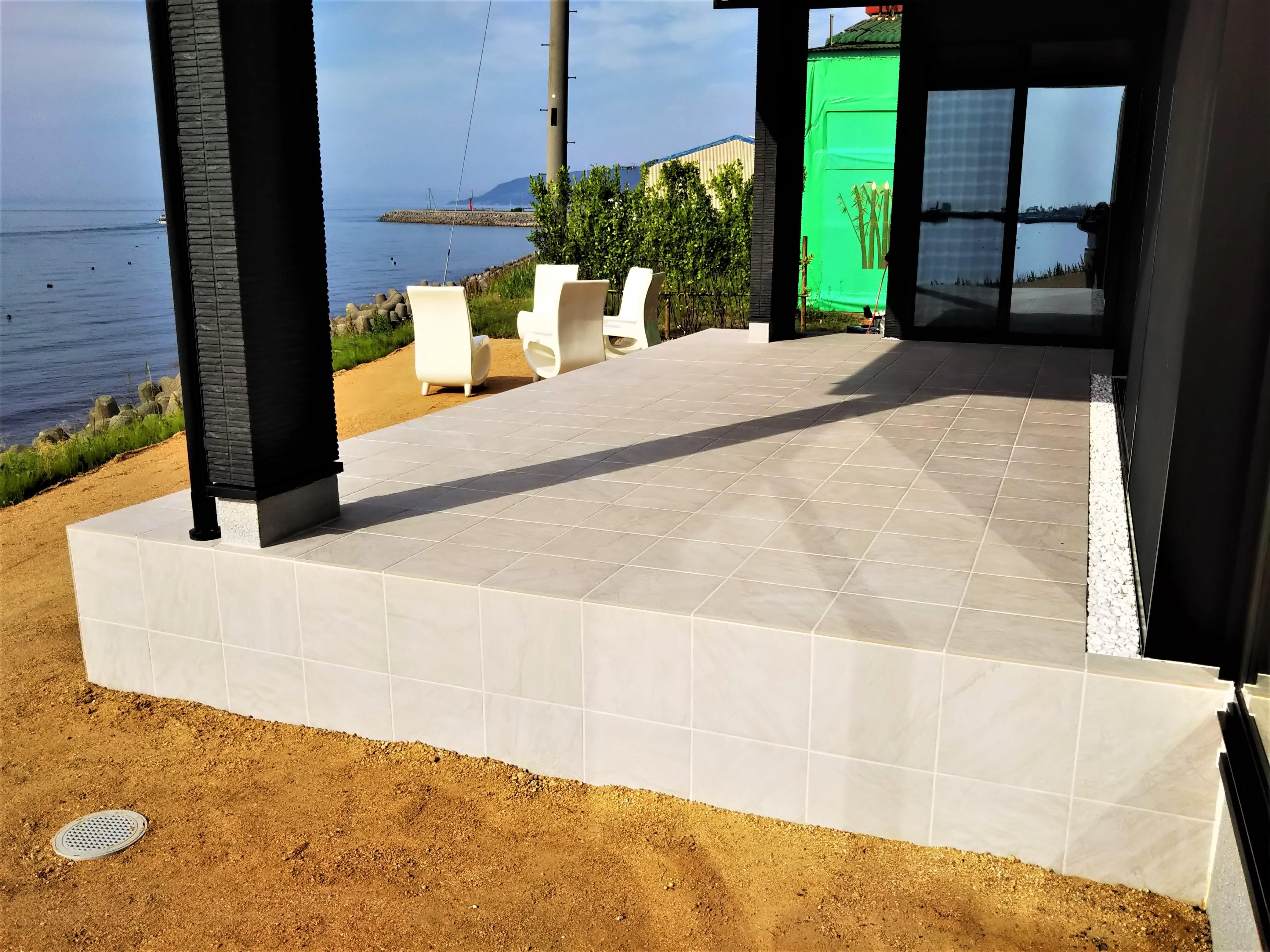 ご覧ください。このロケーション。海沿いのテラスデッキ。心地よいときたら たまりません。時を忘れます。リビングからのフルフラット。サッシ際には白玉石 を敷き詰めていますが、その下は排水用の溝です。