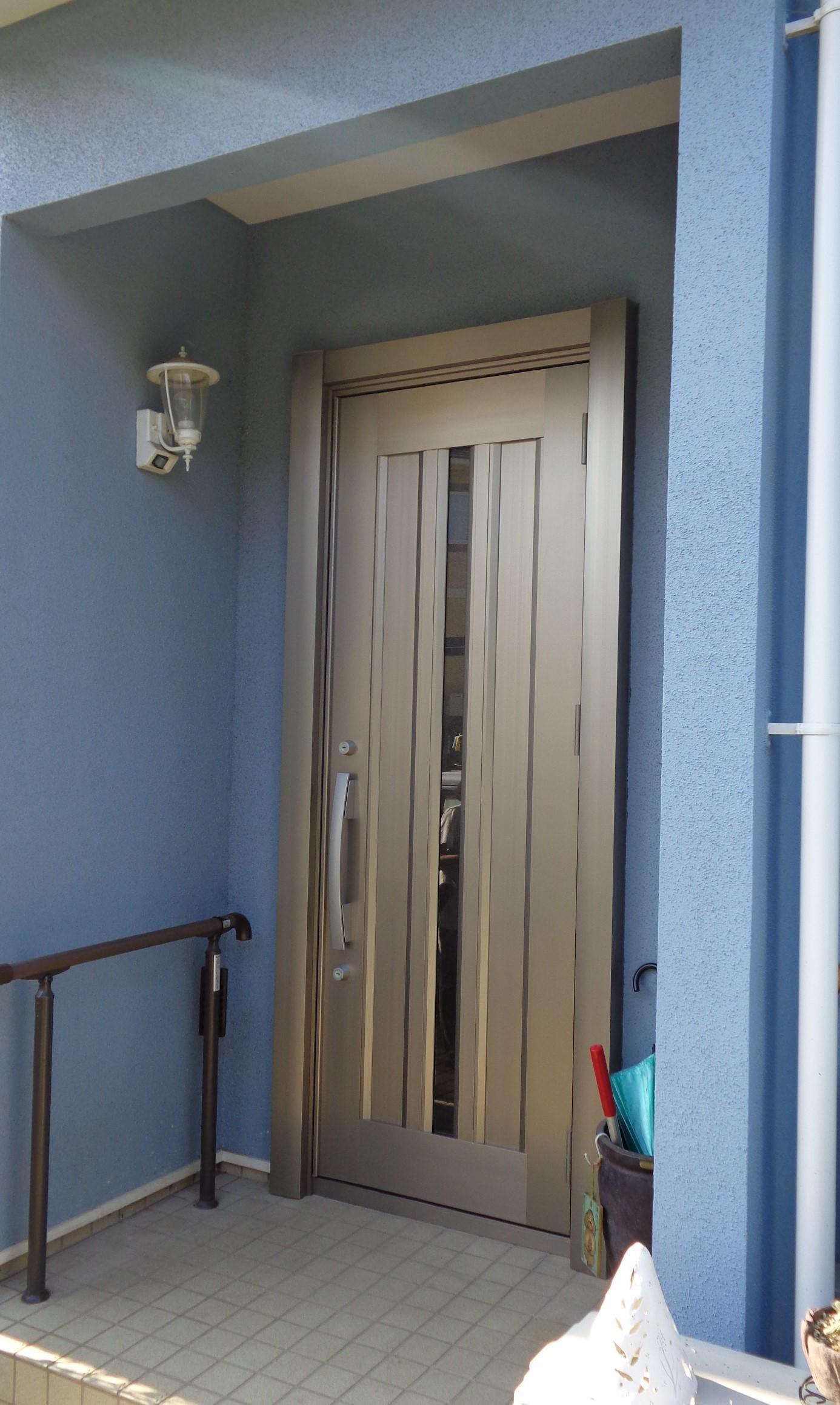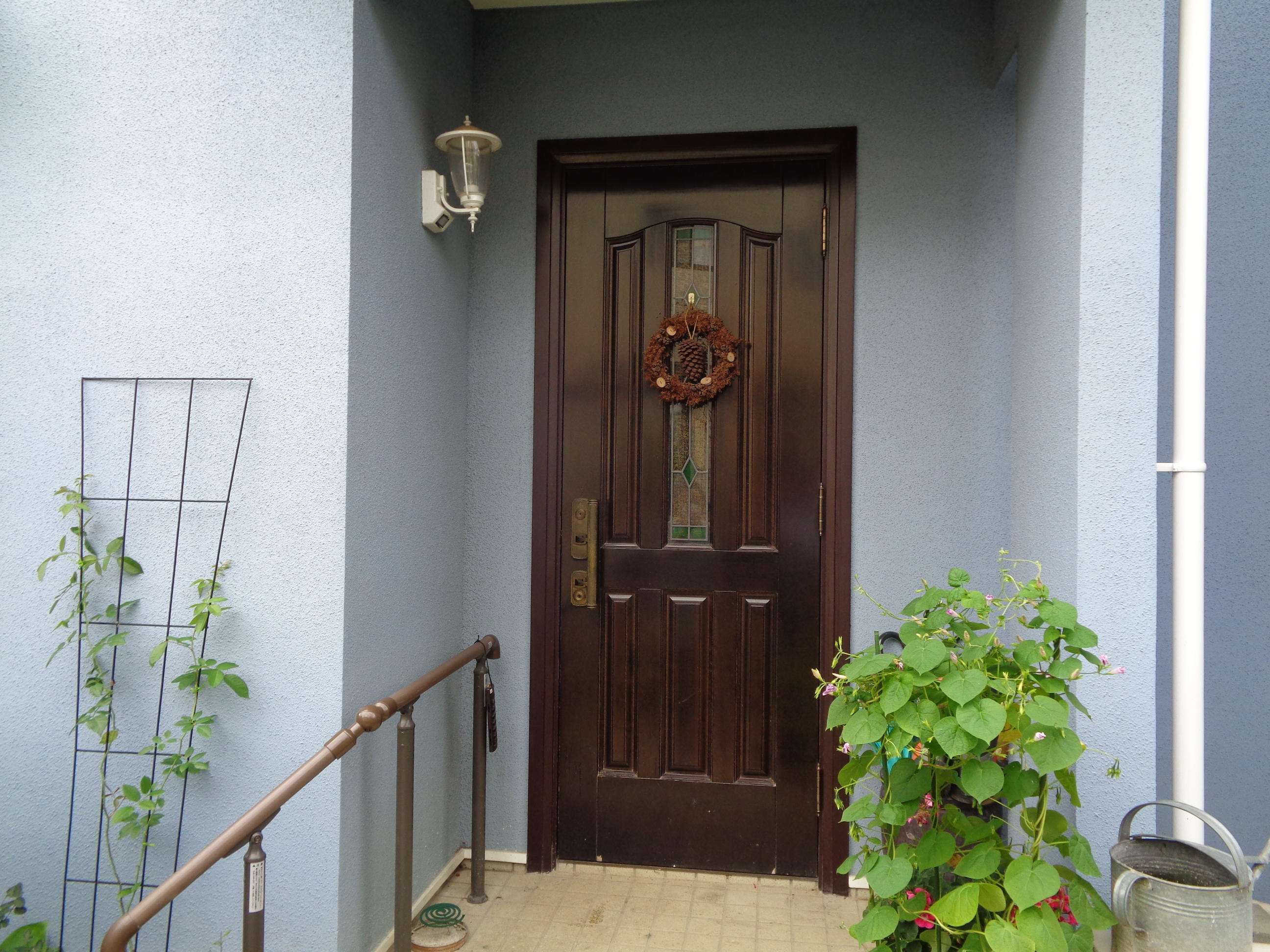 古くなった玄関ドアを交換した事例です。以前は木製ドアだったので重く開閉が 困難だったのですがアルミ製なので軽く容易になりました。