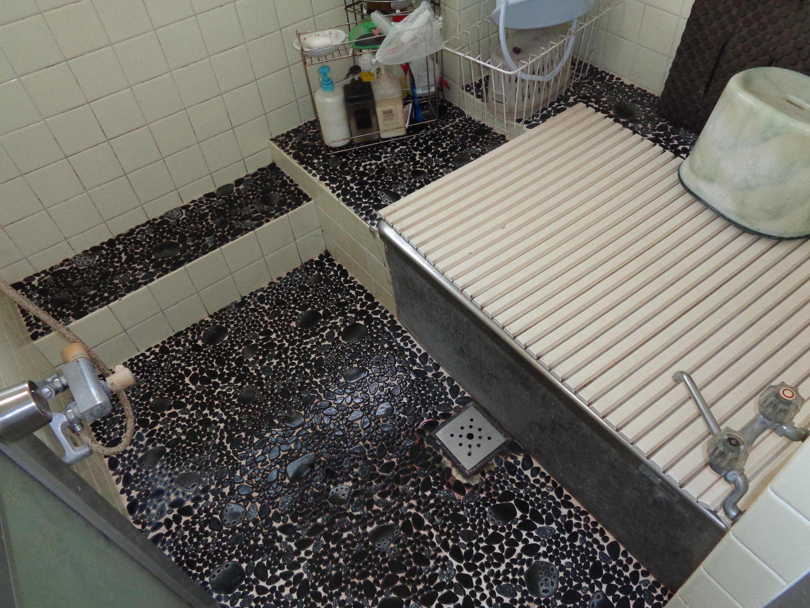 在来タイル風呂リフォームしました。 タイル内に多数の気孔をもった床タイルを使用したので、足裏がヒヤッとすること事が 軽減できます。 同時に水栓や排水も交換し綺麗になりました。